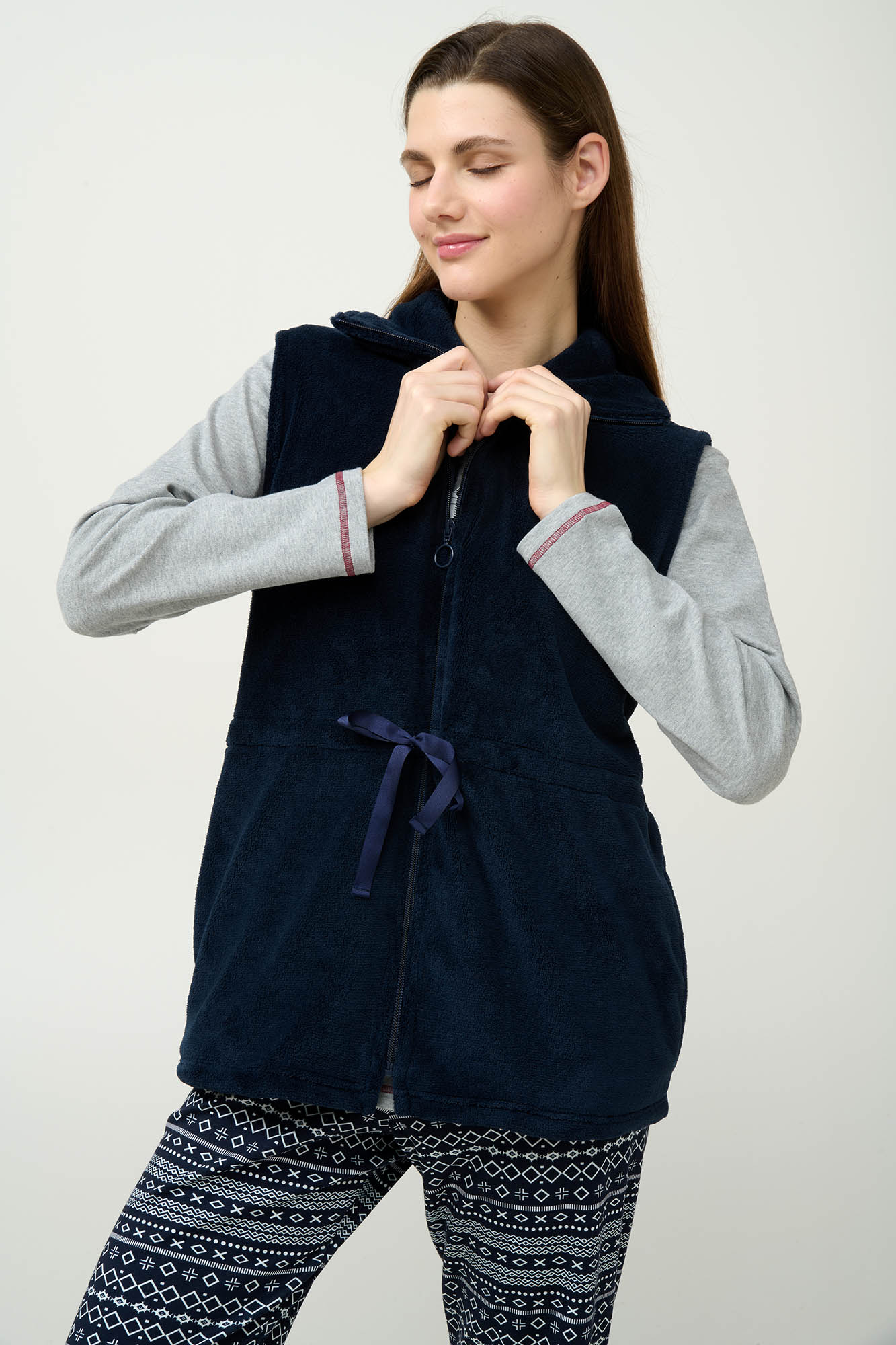 Προσθέστε στη συλλογή σας ένα μονόχρωμο γυναικείο γιλέκο Σχεδιασμένο για άνεση και ευκολία, διαθέτει φερμουάρ μπροστά, πρακτικές πλαϊνές τσέπες και ρυθμιζόμενη μέση για βέλτιστη εφαρμογή. Το απαλό fleece ύφασμα προσφέρει ζεστή αίσθηση στο σώμα, καθιστώντας το ιδανικό για χαλαρές μέρες στο σπίτι φορώντας το πάνω από τις αγαπημένες σας πυτζάμες.
