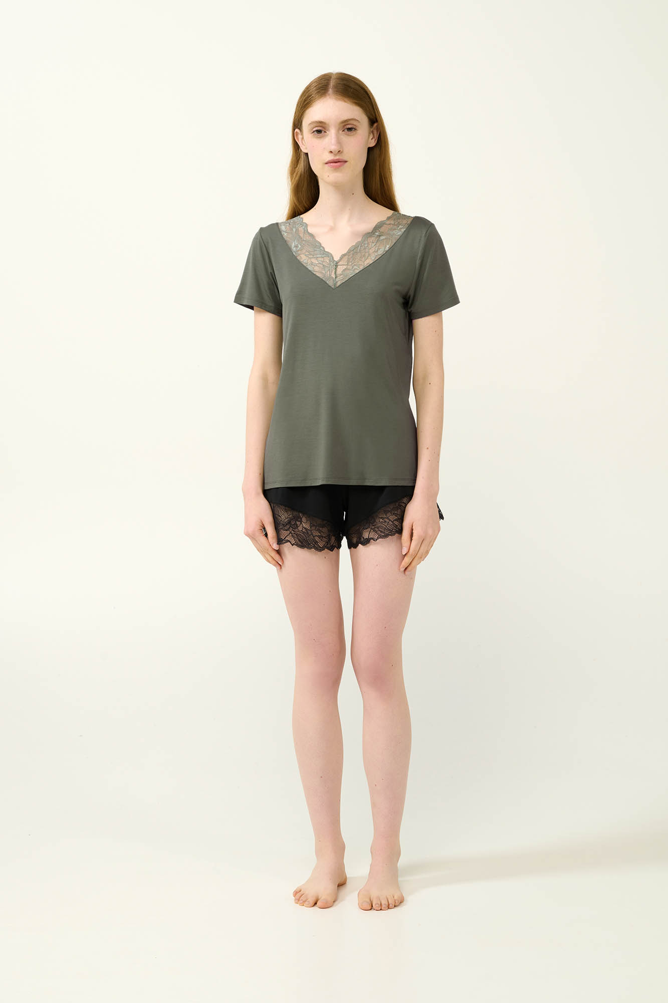 Αυτό το γυναικείο φανελάκι συνδυάζει καθημερινή άνεση και διακριτική κομψότητα. Είναι φτιαγμένο από LENZING Tencel Modal Micro που προσφέρει μοναδική απαλότητα και ελαφριά αίσθηση στο δέρμα. Μονόχρωμο, με κοντά μανίκια και V λαιμόκοψη στο στήθος και την πλάτη, διακοσμημένη με δαντέλα που χαρίζει μια νότα θηλυκότητας. Μπορεί να φορεθεί τόσο ως εσώρουχο ή με ένα παντελόνι στο σπίτι.