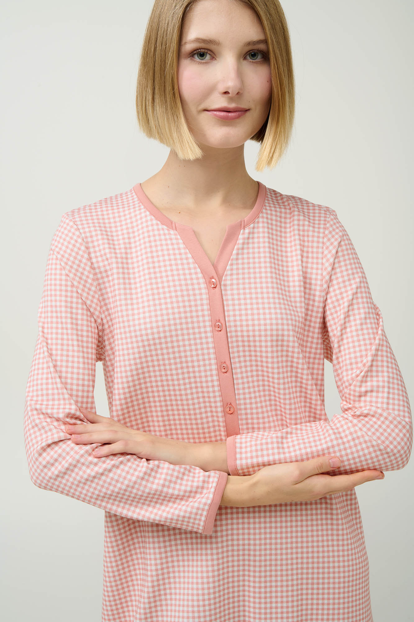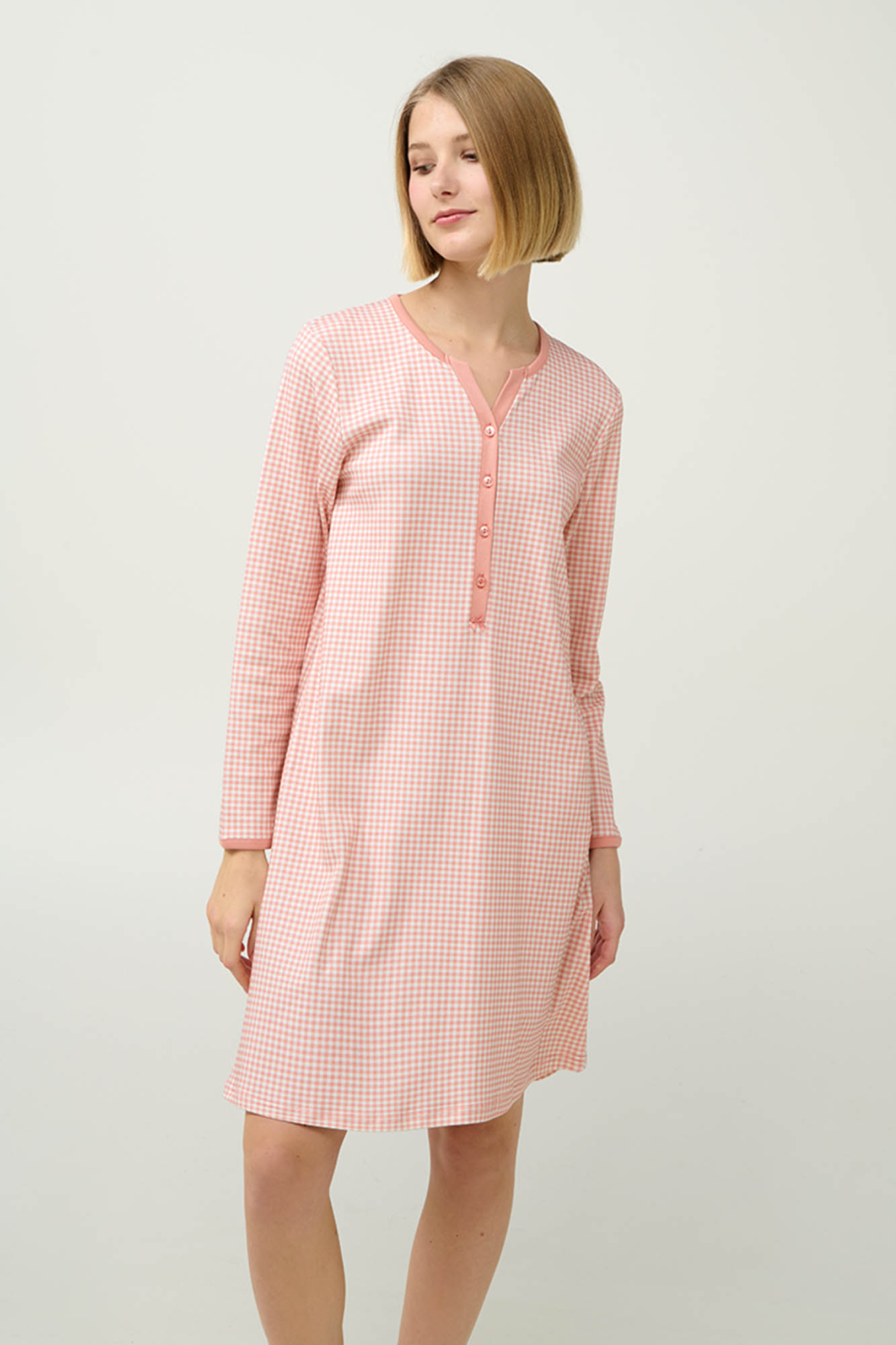 Απολαύστε τη ζεστασιά και την άνεση αυτού του νυχτικού, κατασκευασμένου από 100% βαμβάκι interlock για απαλή και διαπνέουσα αίσθηση. Σχεδιασμένο για τον χειμώνα, διαθέτει πατιλέτα για εύκολη εφαρμογή και μακριά μανίκια. Το θηλυκό ροζ καρό μοτίβο προσθέτει μια χαριτωμένη πινελιά, κάνοντάς το ιδανική επιλογή για ήσυχες νύχτες και χαλαρά πρωινά. Ένα διαχρονικό κομμάτι που συνδυάζει πρακτικότητα και στυλ για καθημερινή άνεση.