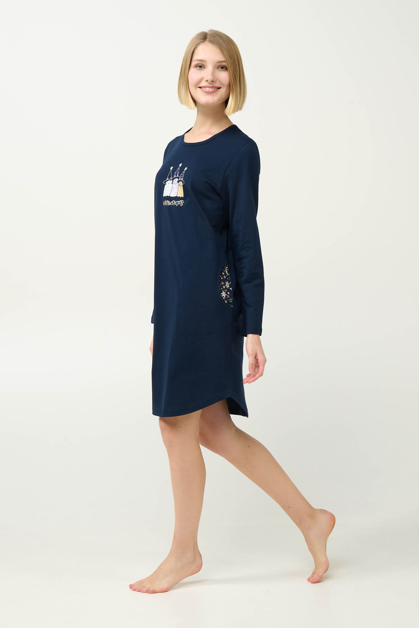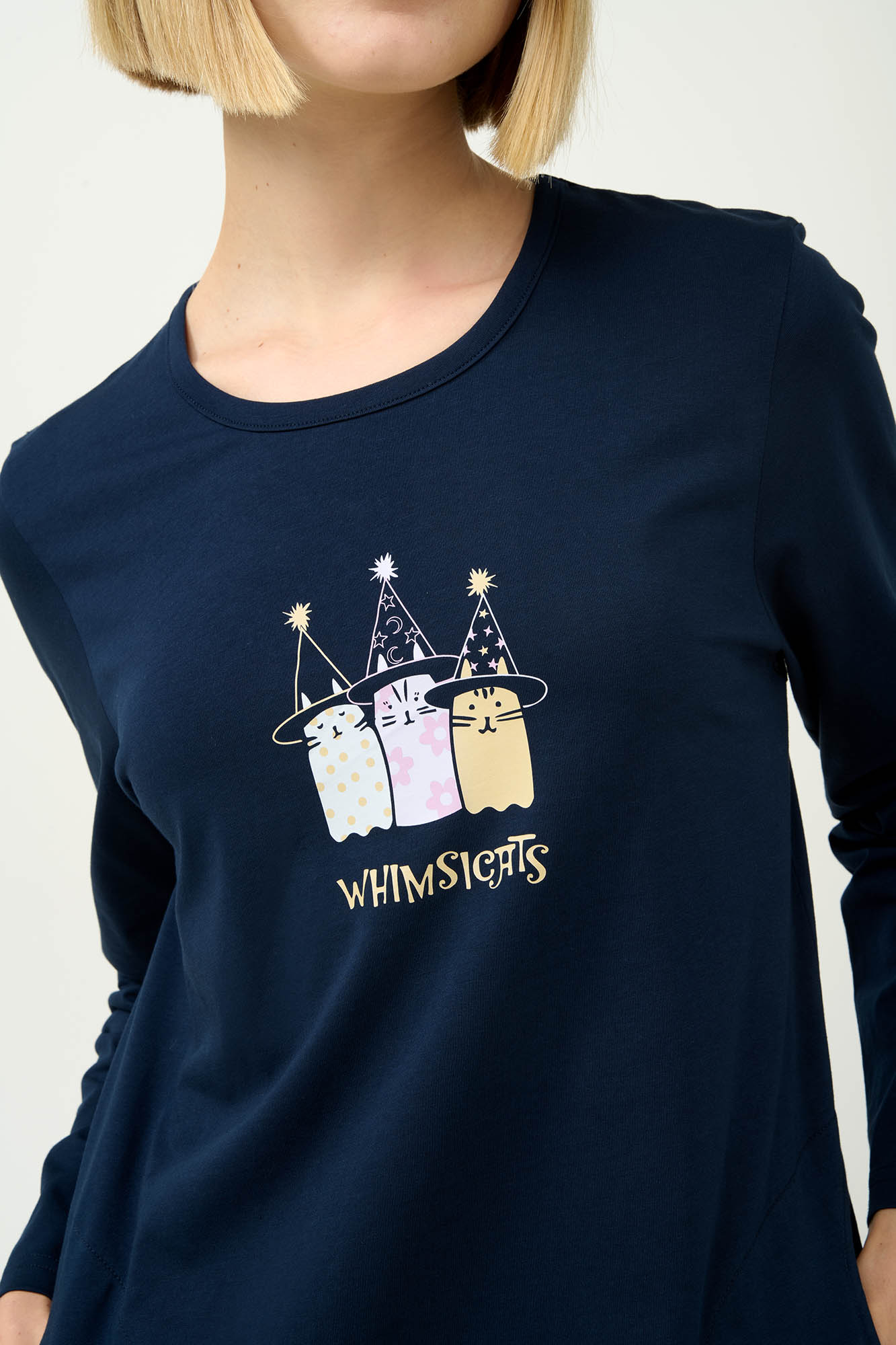 Προσθέστε λίγη μαγεία στις νύχτες σας με αυτό το νυχτικό, κατασκευασμένο από 100% διαπνέον βαμβάκι s. jersey. Σχεδιασμένο με μακριά μανίκια, πλαϊνές τσέπες και χαλαρή γραμμή έχει στο στήθος ένα όμορφο τύπωμα με χαριτωμένες γατούλες που φορούν μυτερά καπέλα. Ένα νυχτικό που συνδυάζει άνεση, πρακτικότητα και φαντασία που θα απολαύσετε στις στιγμές χαλάρωσης σας.