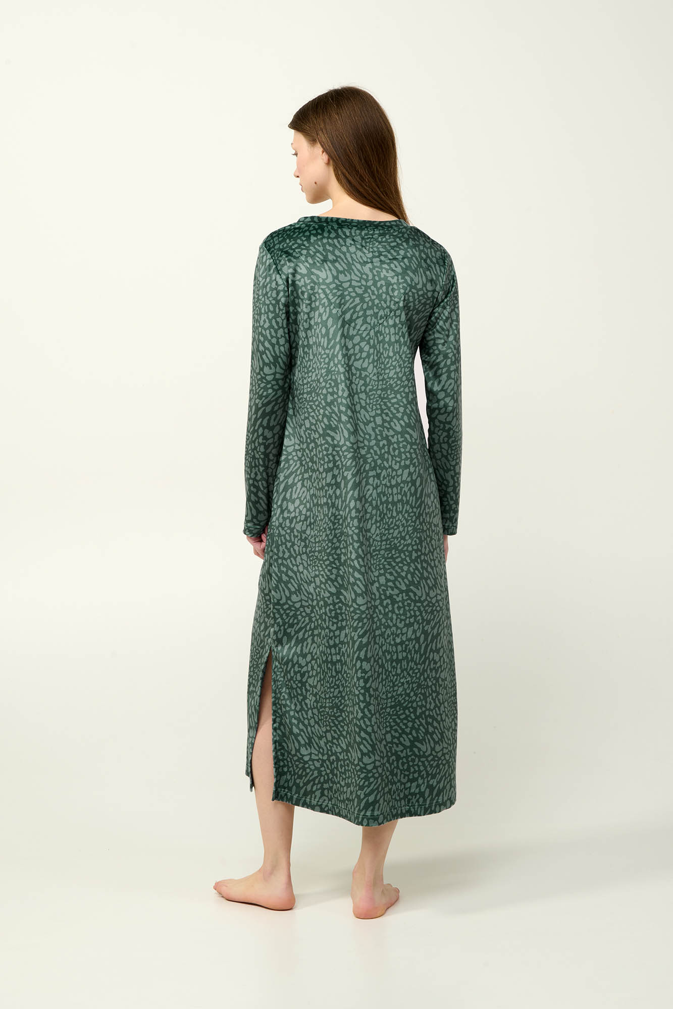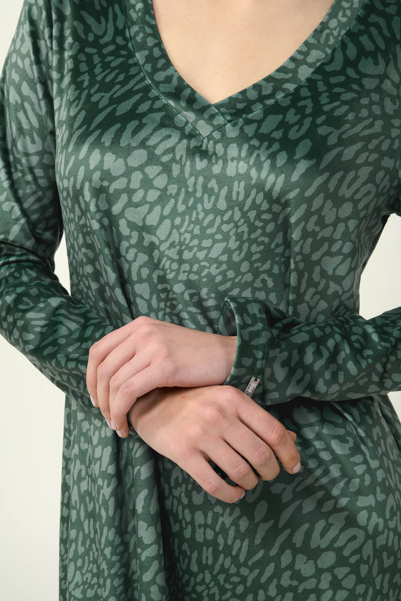 Απολαύστε την απόλυτη άνεση και στυλ που μπορεί να σας προσφέρει αυτό το φλοράλ φόρεμα από μαλακό ελαστικό βελούδο. Η λαιμόκοψη V προσθέτει μια νότα κομψότητας ενώ η χαλαρή γραμμή του εξασφαλίζει ελευθερία κινήσεων και άνετη εφαρμογή. Ιδανικό για ξεκούραση στο σπίτι ή χαλαρές εξορμήσεις, αυτό το φόρεμα συνδυάζει πολυτελή απαλότητα και άνεση σε ένα μοντέρνο animal print σε πράσινη απόχρωση.