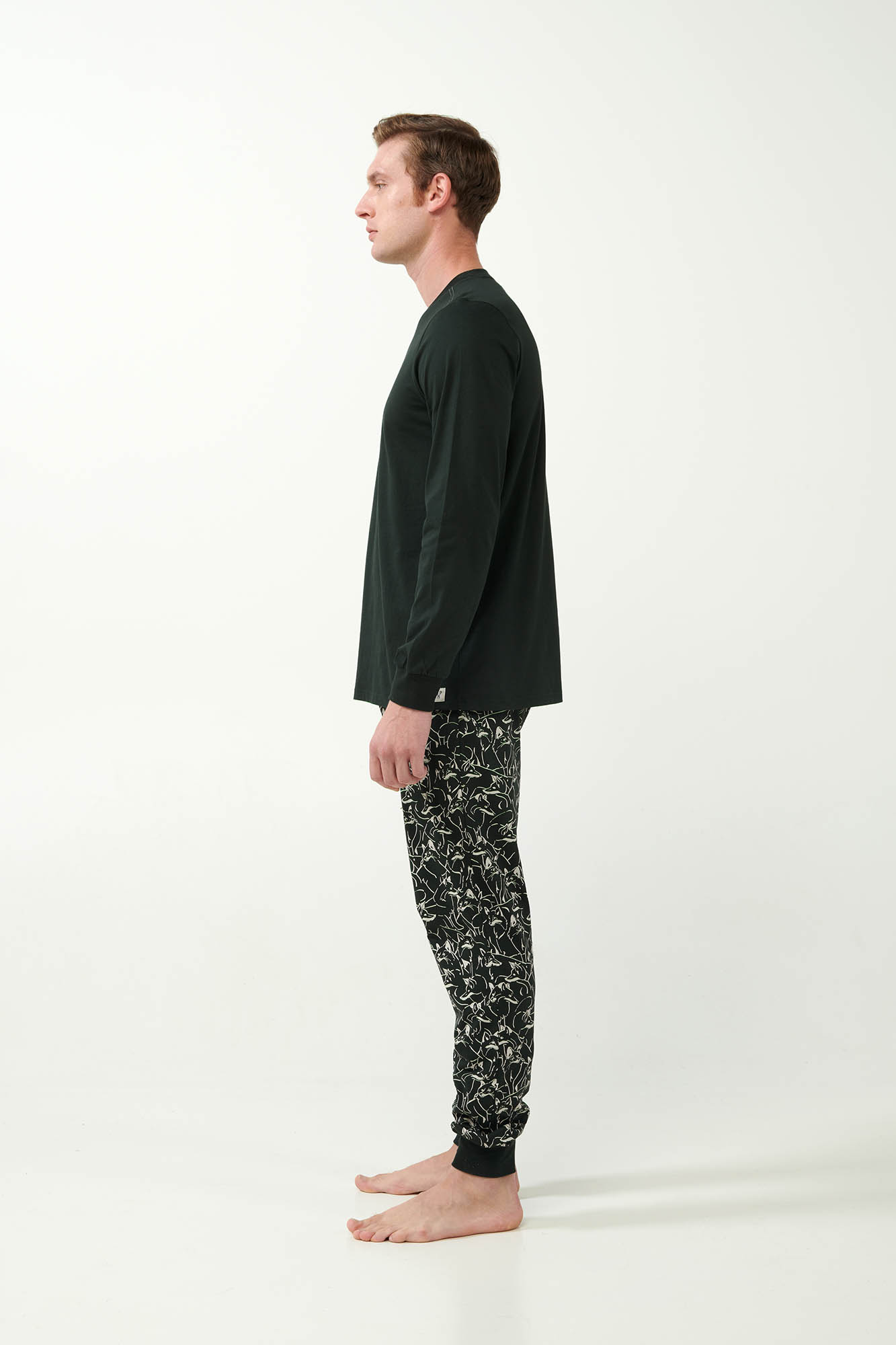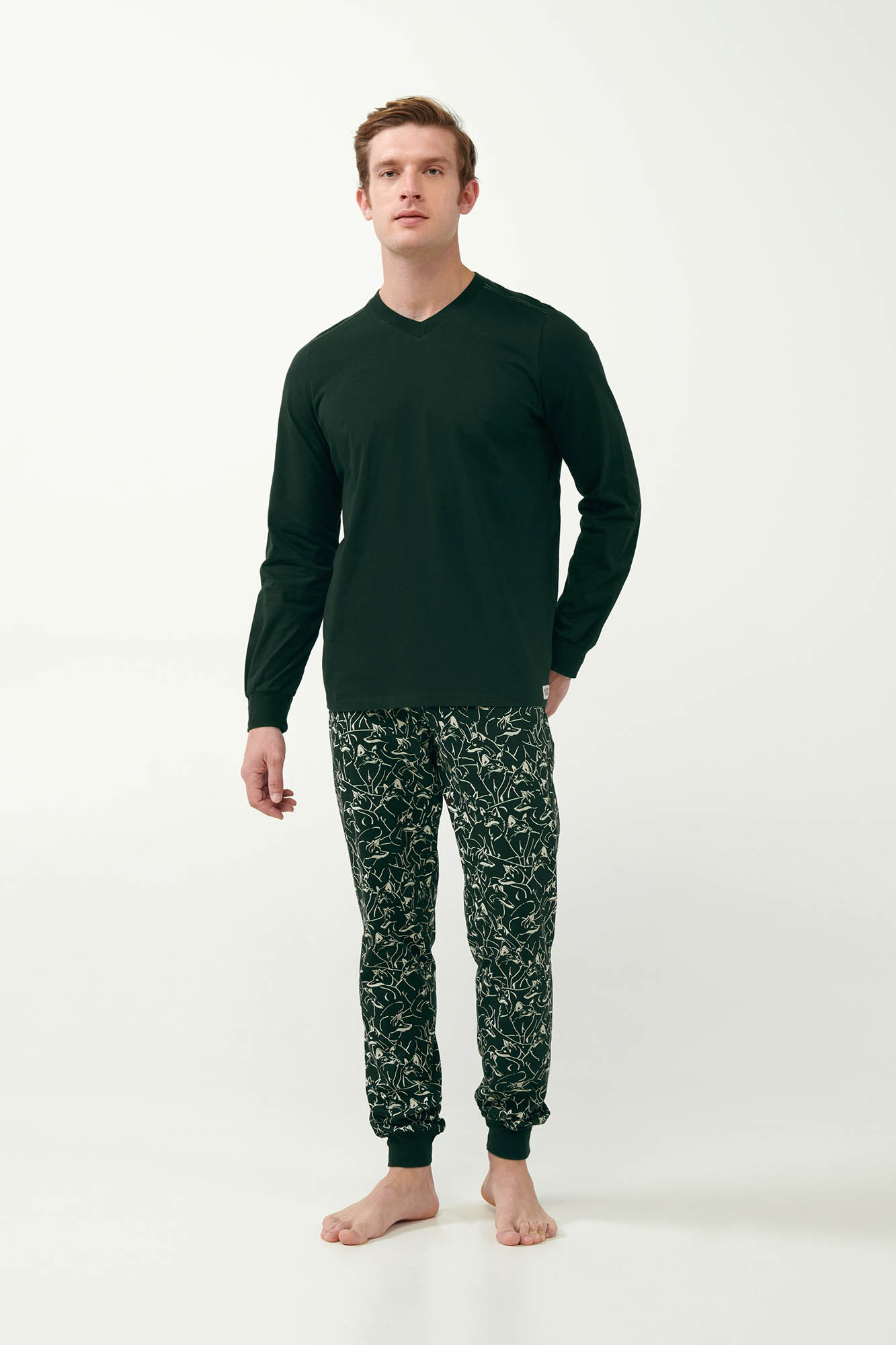 Απολαύστε κάθε στιγμή της ημέρας σας στο σπίτι με ένα σετ ανδρικές πυτζάμες κατασκευασμένο από 100% βαμβάκι s. jersey με που επιτρέπει στο δέρμα να αναπνέει και προσφέρει απαλό άγγιγμα στο σώμα. Το σετ αποτελείται από μονόχρωμο τοπ με V λαιμόκοψη και παντελόνι με μανσέτες που αποτυπώνει λευκούς λύκους σε σκούρο καμβά. Μια πρόταση που θα δώσει άνεση στους λάτρες της φύσης και όχι μόνο.