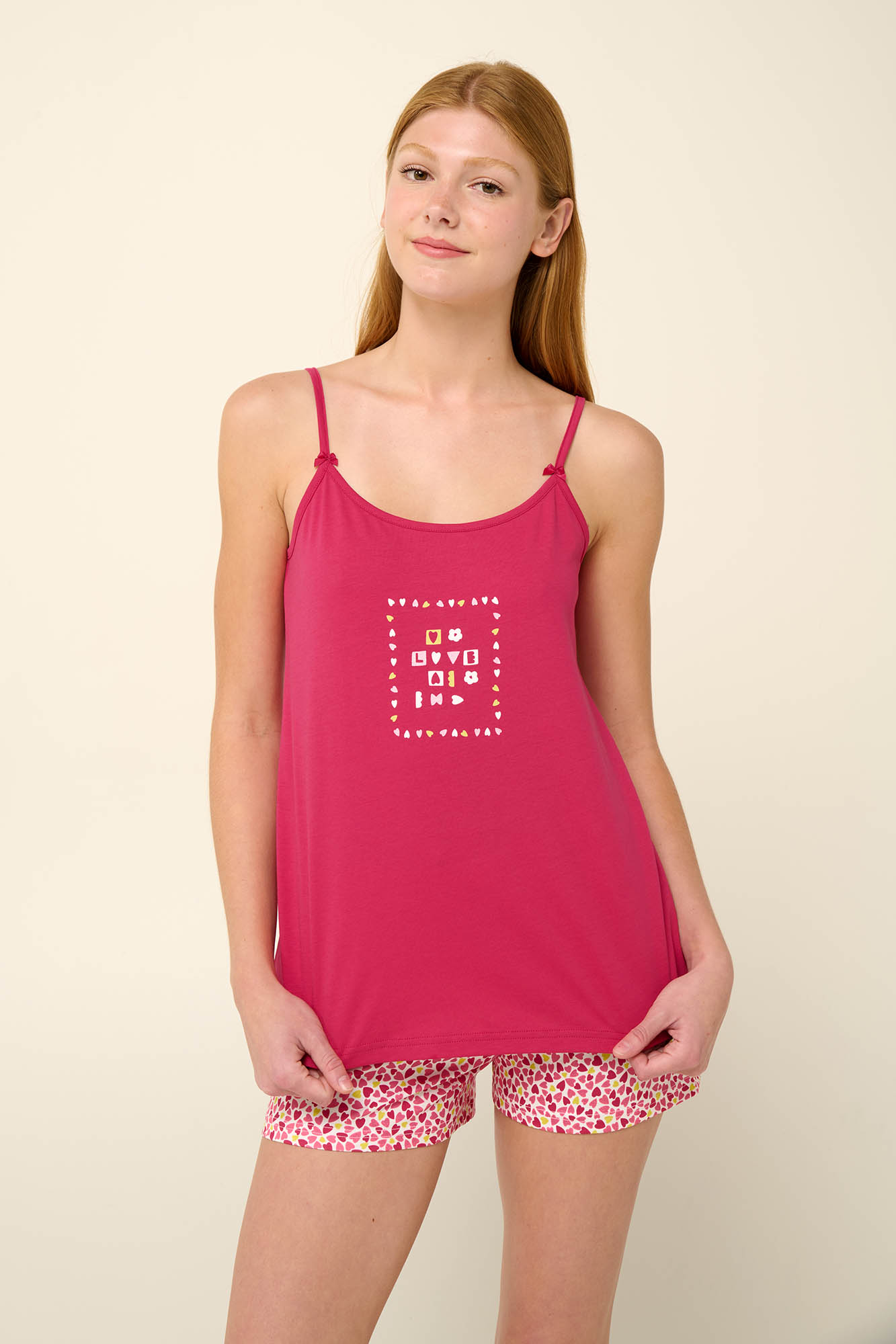 Αφεθείτε στην άνεση που σας προσφέρει ένα καλοκαιρινό babydoll κατασκευασμένο από 100% βαμβάκι που επιτρέπει στο δέρμα να αναπνέει και χαρίζει απαλή αίσθηση στο σώμα. Αποτελείται από κοντό παντελόνι με χαριτωμένο μωσαϊκό από καρδιές και μπλούζα με ρυθμιζόμενες τιράντες και τύπωμα στο στήθος. Σχεδιασμένο σε κανονική γραμμή που θα αναπτύξει τη θηλυκότητα σας θα σας βοηθήσει να απολαύσετε το βραδινό σας ύπνο.