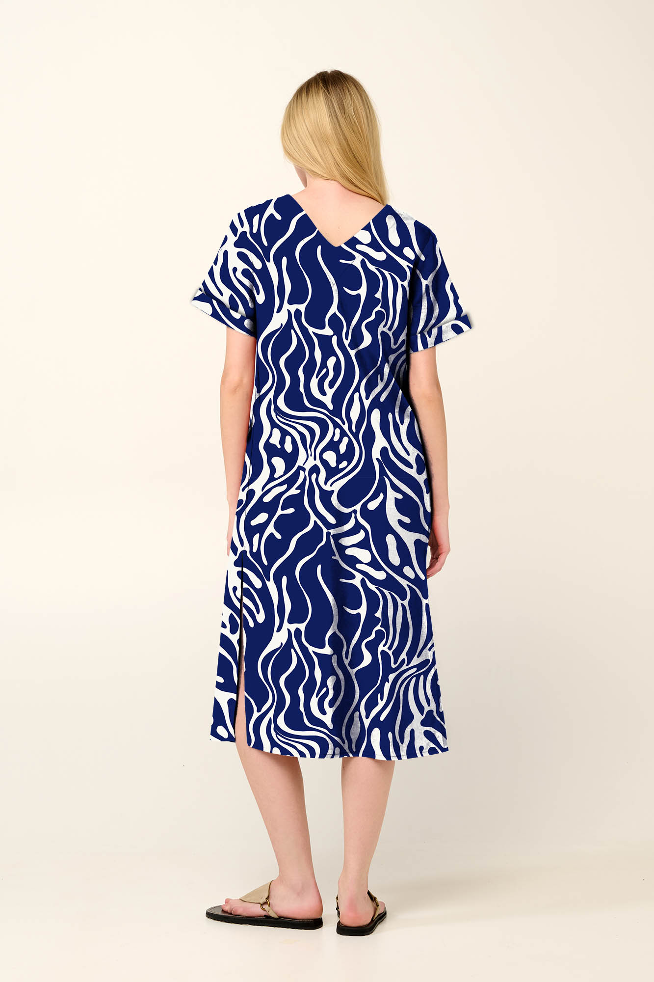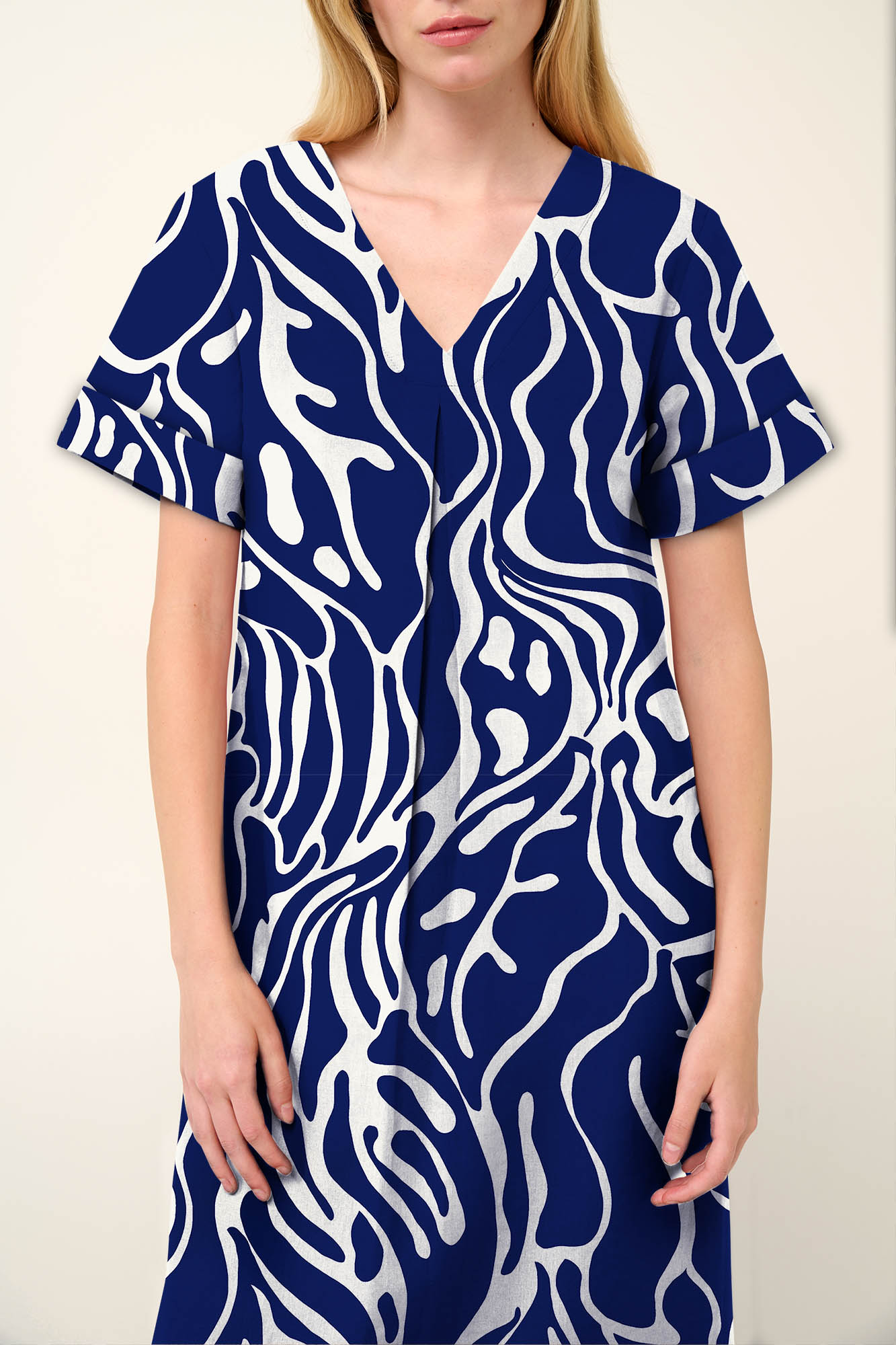 Επιλέξτε ένα ανάλαφρο και κομψό καλοκαιρινό φόρεμα με εντυπωσιακό αφηρημένο μοτίβο κοραλλιών του Αιγαίου σε μπλε και λευκό χρώμα. Κατασκευασμένο από viscose ποπλίνα, χαρίζει χαλαρή και αέρινη εφαρμογή. Η θηλυκή V λαιμόκοψη μπροστά και στη πλάτη προσθέτει κομψότητα, ενώ η πιέτα στο στήθος και τα πλαϊνά ανοίγματα προσφέρουν άνεση και ελευθερία κινήσεων. Απολαύστε τις καλοκαιρινές σας εξορμήσεις παραμένοντας δροσερή.