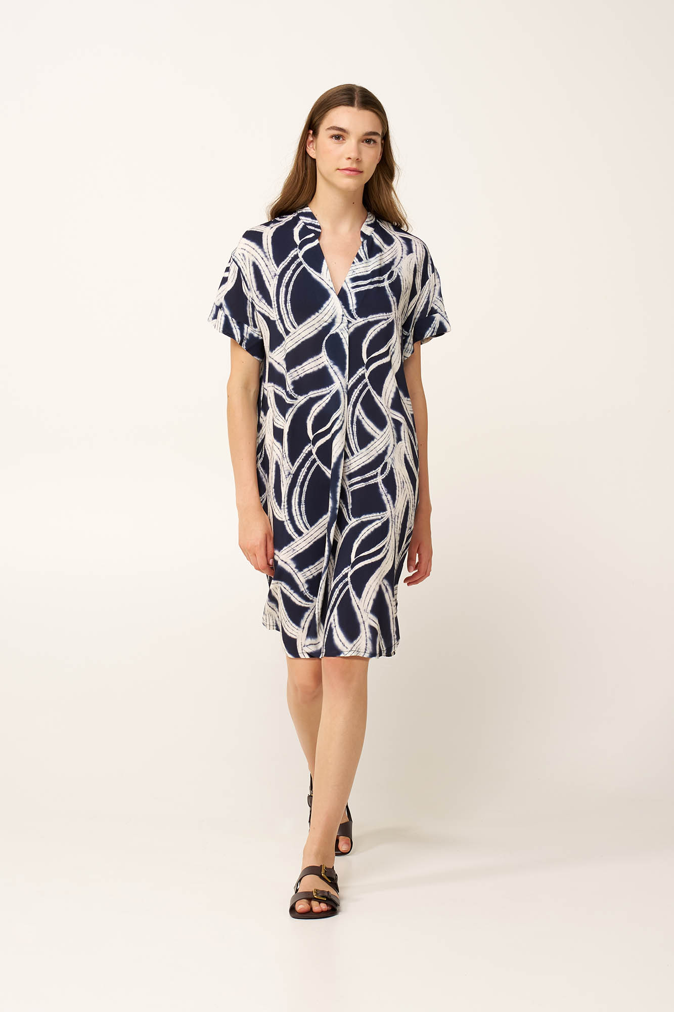 Προσθέστε στη συλλογή σας ένα καλοκαιρινό φόρεμα από 100% viscose ποπλίνα, που χαρίζει απαλή και δροσερή αίσθηση στο δέρμα. Η V λαιμόκοψη προσθέτει θηλυκότητα, ενώ το αφηρημένο εκρού μοτίβο πάνω σε βαθύ μπλε καμβά δημιουργεί εντυπωσιακή αντίθεση και σύγχρονο, εκφραστικό χαρακτήρα. Κομψό κάτω από τον ήλιο ή τα αστέρια, είναι ιδανικό για κάθε στιγμή της ημέρας.