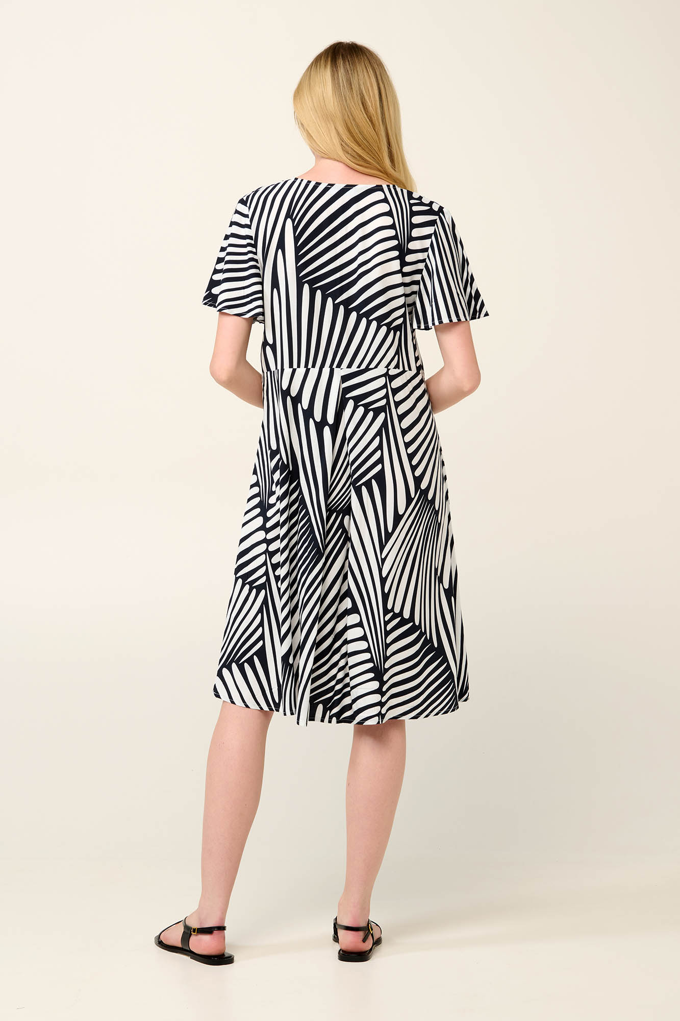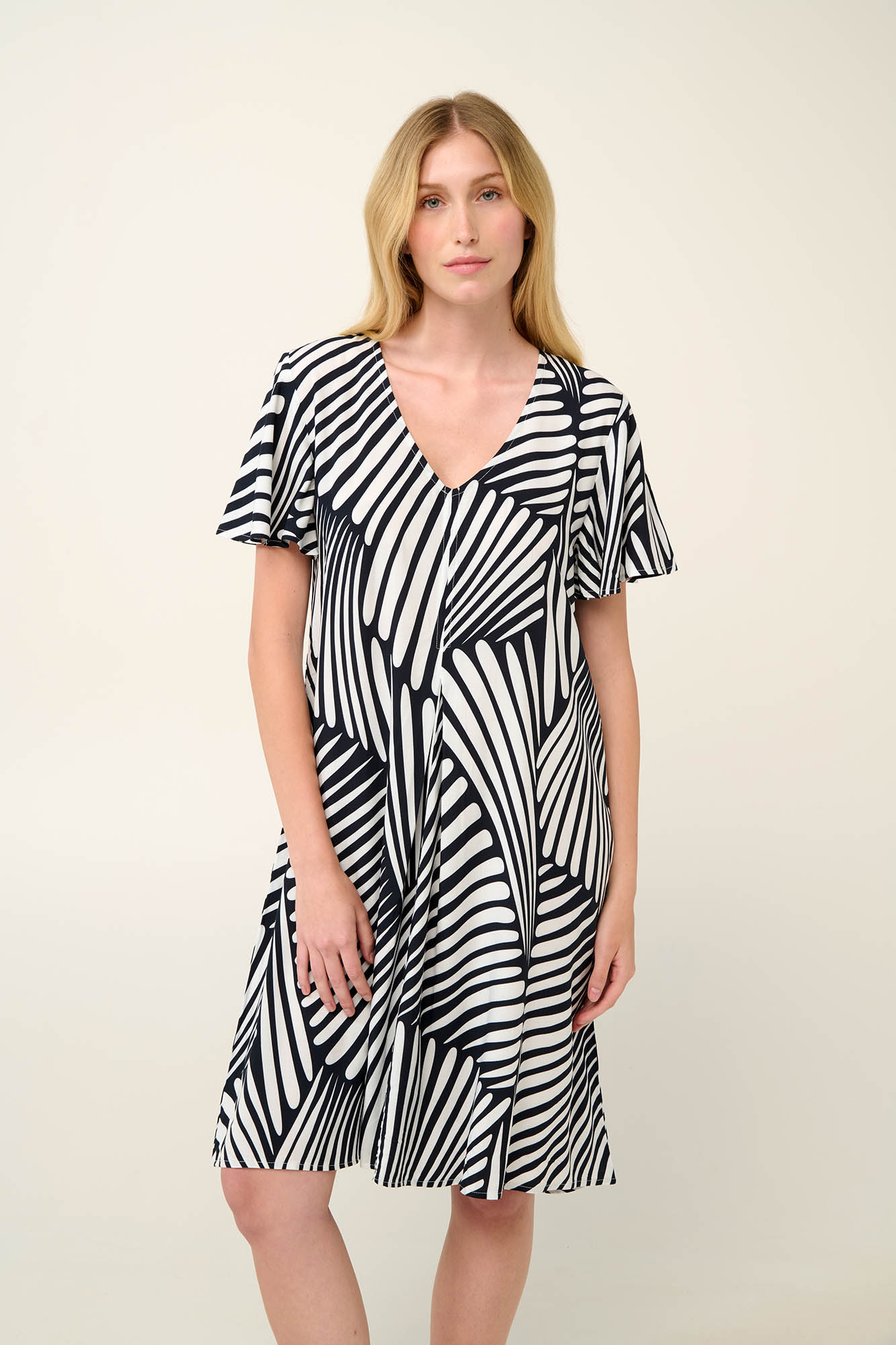 Απολαύστε κάθε στιγμή με ένα καλοκαιρινό φόρεμα από ελαφριά και δροσερή viscose ποπλίνα Σχεδιασμένο σε εντυπωσιακό ασπρόμαυρο αφηρημένο μοτίβο ζέβρας που κεντρίζει το ενδιαφέρον, με κοντό μανίκι, λαιμόκοψη σε σχήμα V και πιέτα μπροστά για μεγαλύτερη άνεση και ελευθερία. Ανανεώστε την γκαρνταρόμπα σας με ένα κομψό καθημερινό φόρεμα σε χαλαρή γραμμή.