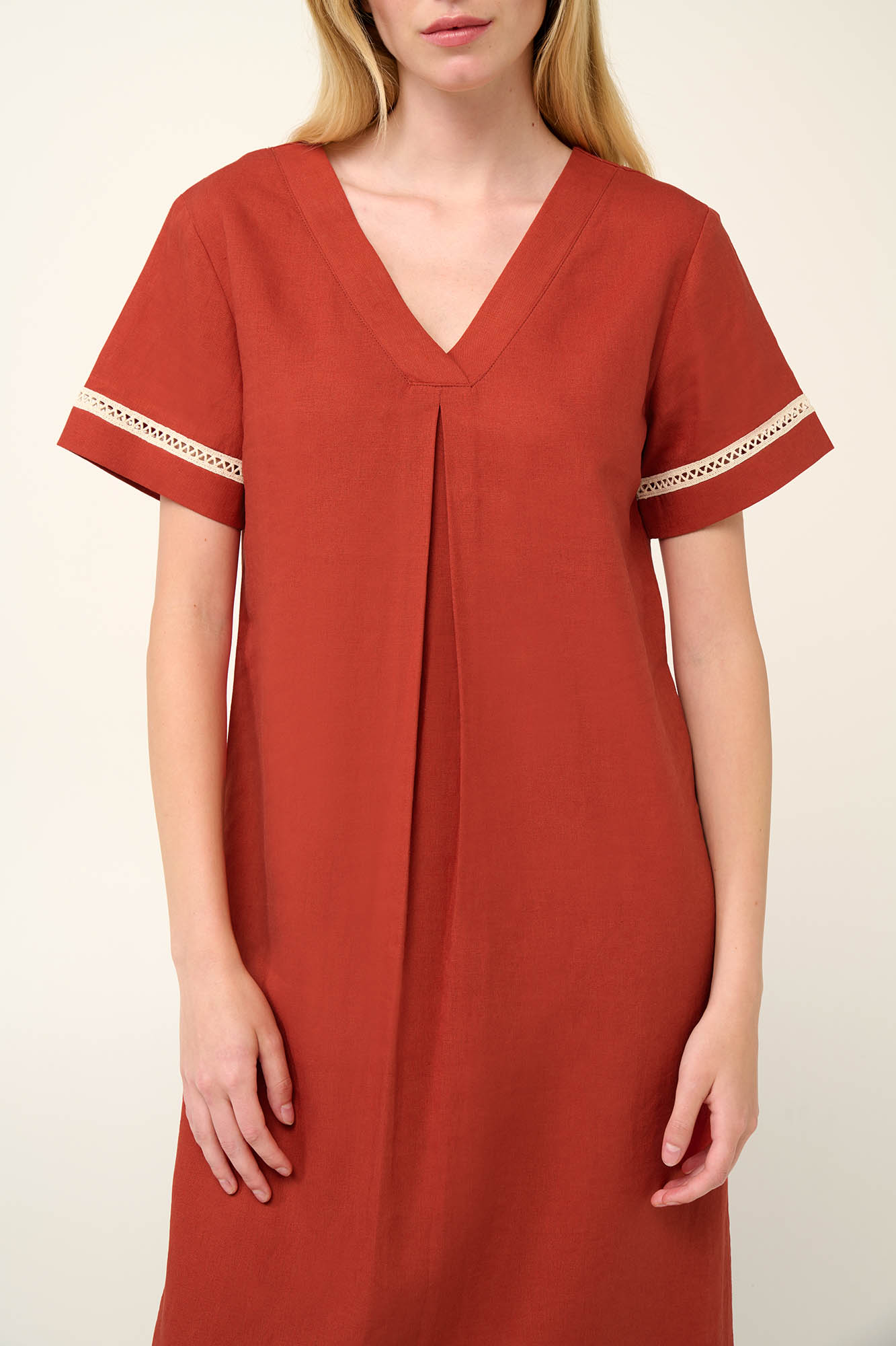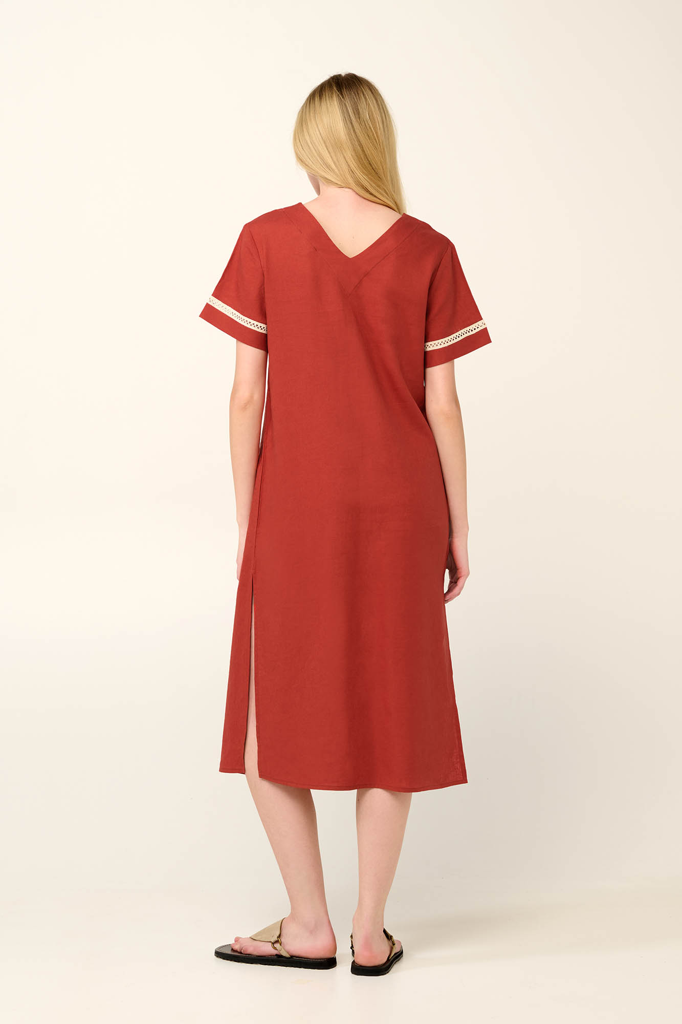 Ένα εκλεπτυσμένο καλοκαιρινό φόρεμα που συνδυάζει άνεση και διακριτική κομψότητα. Φτιαγμένο από ελαφριά ποπλίνα από συνδυασμό λινού και rayon, χαρίζει αέρινη αίσθηση και δροσιά στις ζεστές μέρες. Η κολακευτική V λαιμόκοψη και οι διακριτικές λεπτομέρειες στα μανίκια προσθέτουν μια πινελιά γοητείας, ιδανική για κάθε περίσταση, από χαλαρές βόλτες έως ρομαντικά βράδια δίπλα στη θάλασσα.