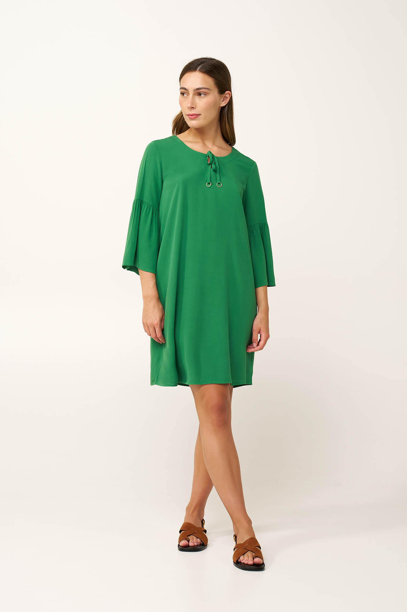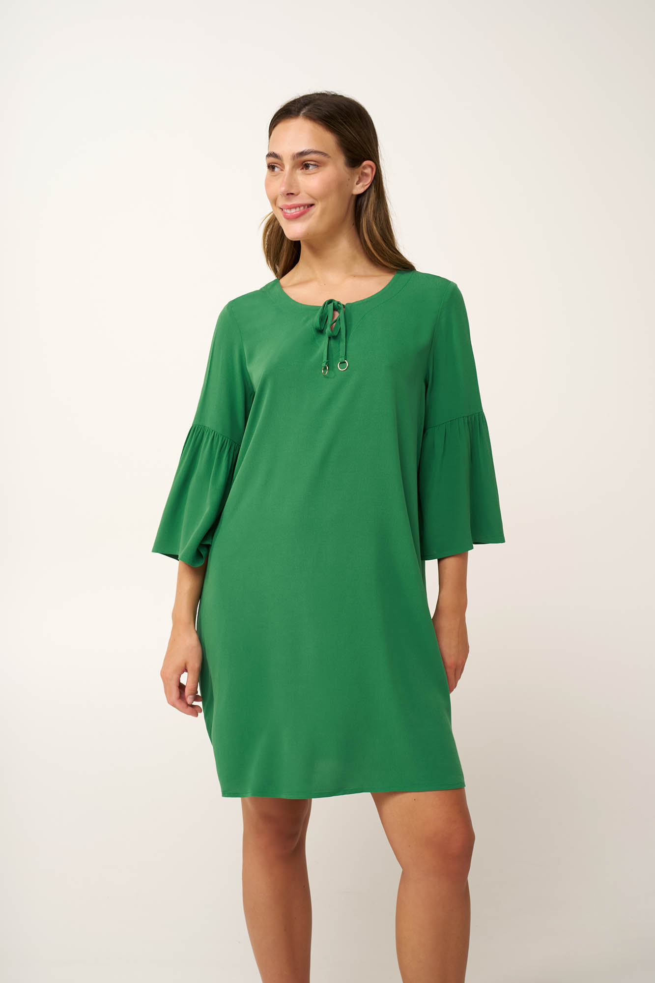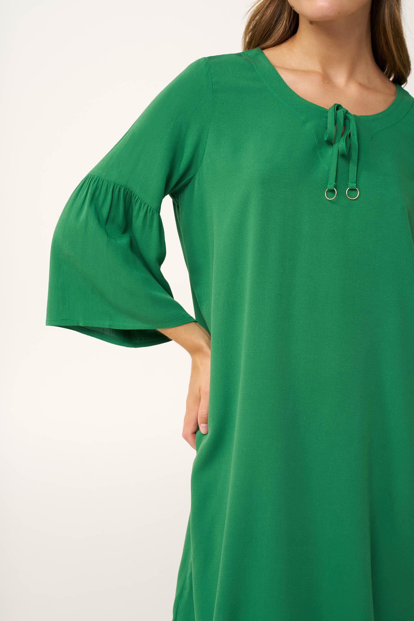Αέρινο και ανάλαφρο αυτό το καλοκαιρινό φόρεμα από 100% κρεπ marocaine viscose, σε πλούσια πράσινη απόχρωση, συνδυάζει άνεση και δροσερή αίσθηση που θα απολαύσετε τις πιο ζεστές ημέρες. Είναι σχεδιασμένο με στρογγυλή λαιμόκοψη που δένει μπροστά και εντυπωσιακά, φαρδιά μανίκια που κινούνται ακολουθώντας φυσικά το σώμα. Ιδανικό για ηλιόλουστες στιγμές στη πόλη και τις καλοκαιρινές διακοπές.
