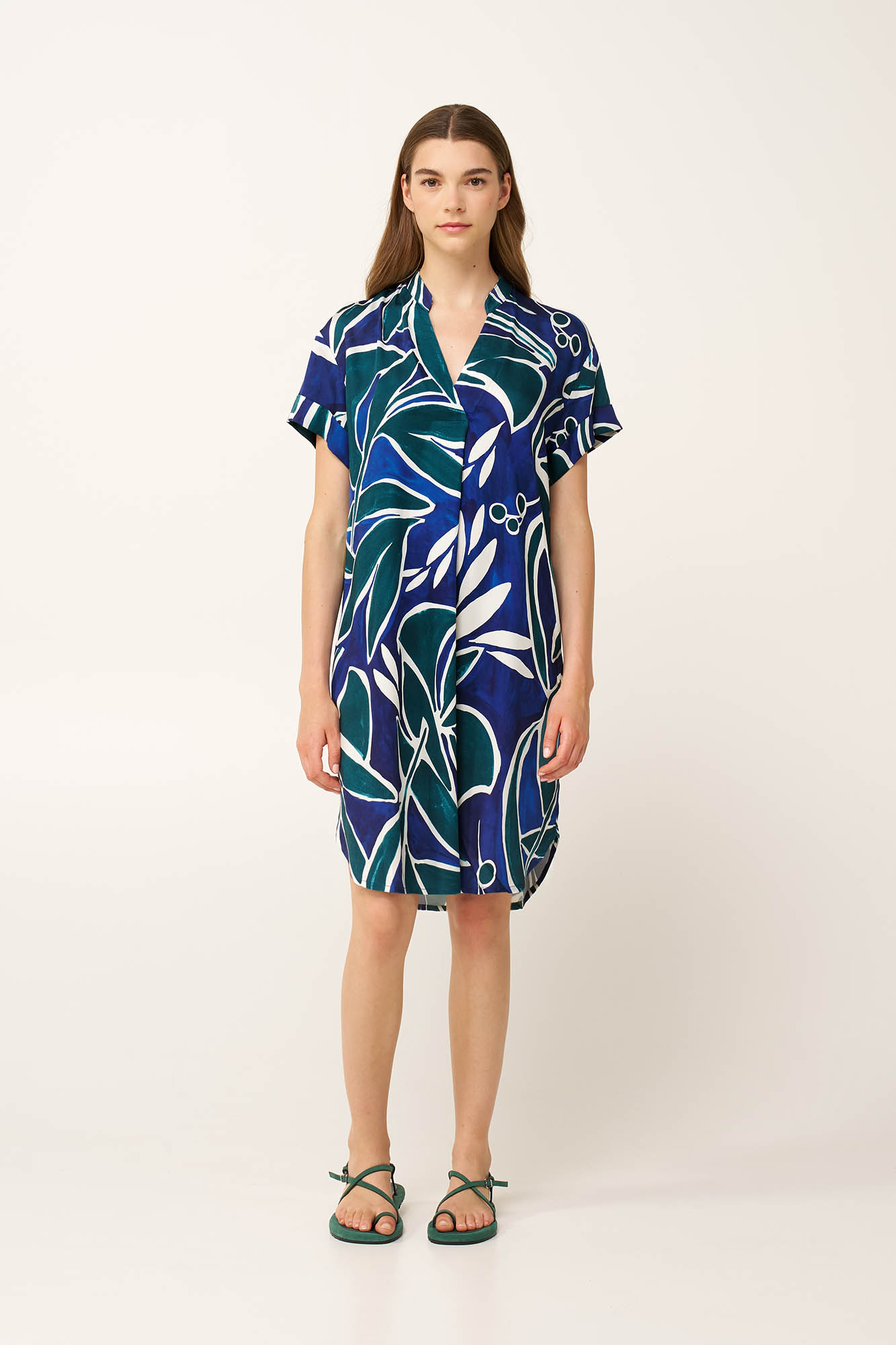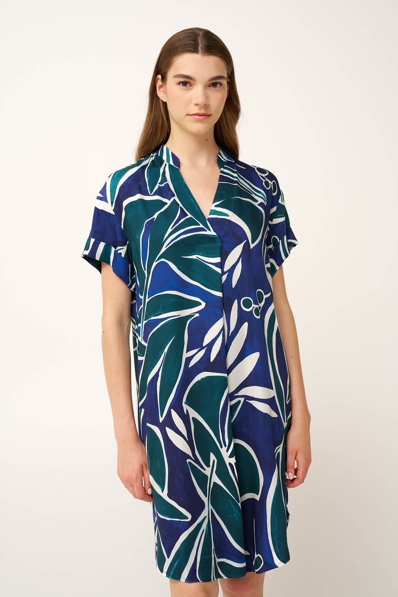 Επιλέξτε ένα καλοκαιρινό φόρεμα, κατασκευασμένο από 100% viscose ποπλίνα, που προσφέρει απαλή και δροσερή αίσθηση τις ζεστές ημέρες. Η V λαιμόκοψη προσθέτει μια θηλυκή νότα, ενώ η χαλαρή γραμμή χαρίζει φυσική κίνηση σε κάθε βήμα. Διακοσμημένο με έντονα αφηρημένα σχήματα σε ωκεάνιους τόνους, το γραφικό print χαρίζει σύγχρονο χαρακτήρα και αυτοπεποίθηση. Σχεδιασμένο να κινείται με το καλοκαιρινό αεράκι και να κλέβει τις εντυπώσεις, αποτυπώνει την αύρα του καλοκαιριού.