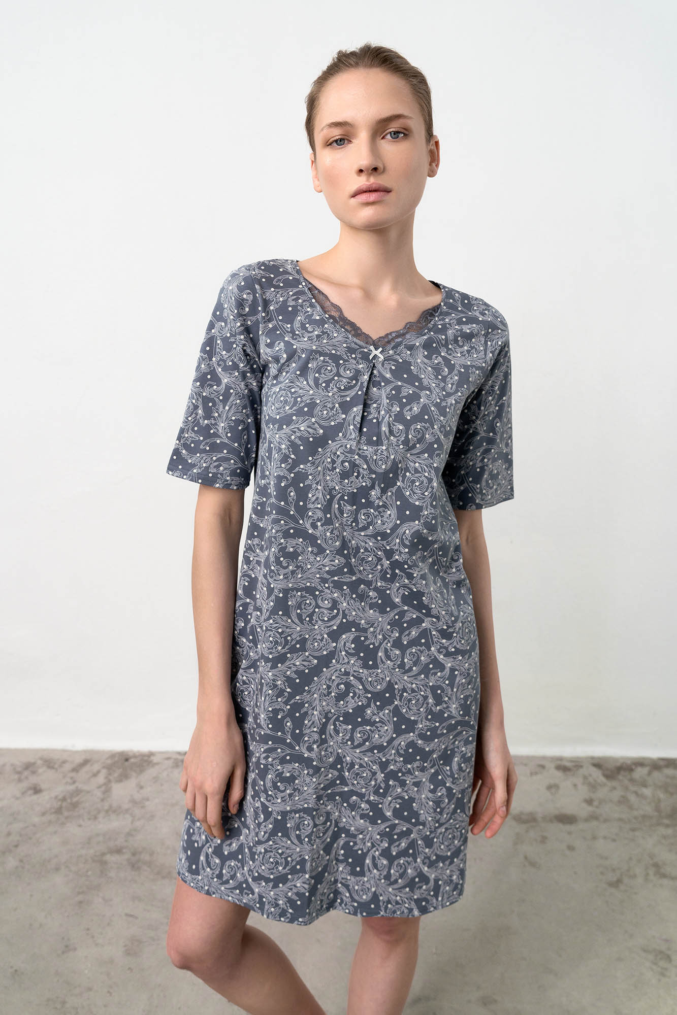 Νυχτικό με κοντό μανίκι και λαιμόκοψη με δαντέλα. Ένα διακριτικό, φλοράλ σχέδιο που θα σας προσφέρει στυλ και άνεση όλο το καλοκαίρι.