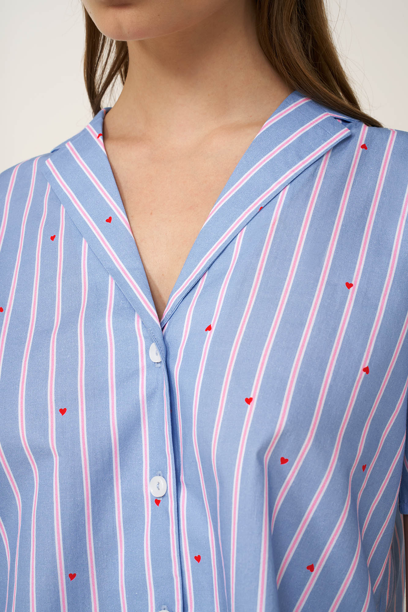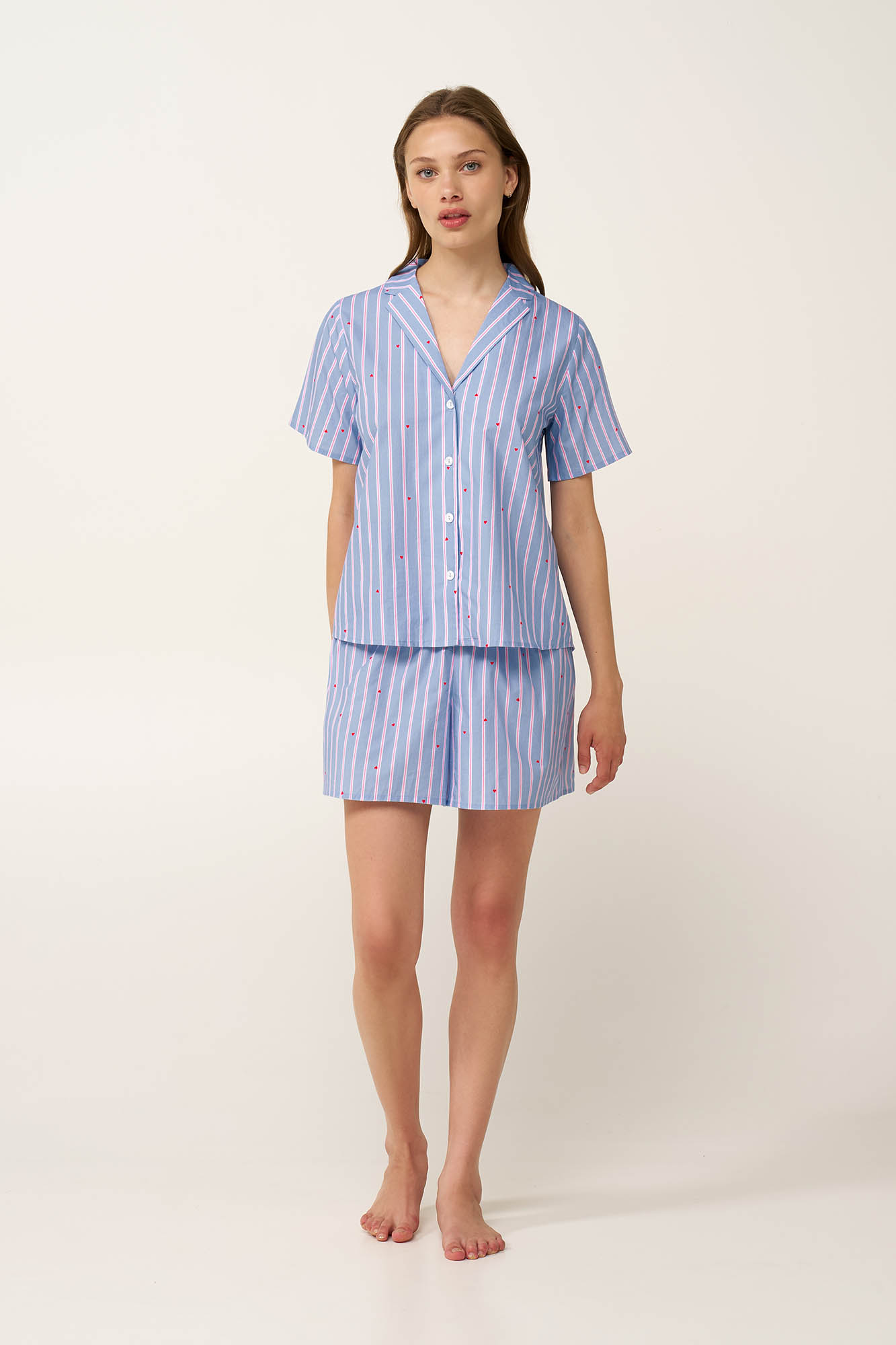 Αφεθείτε στην άνεση του καλοκαιριού με αυτό το γυναικείο σετ πυτζάμες από 100% βαμβακερή ποπλίνα, που χαρίζει δροσερή, διαπνέουσα και φυσικά δροσερή αίσθηση στο δέρμα. Αποτελείται από ένα κλασικό κουμπωτό τοπ και ένα κοντό παντελόνι και ειναι διακοσμημένο από ένα μοτίβο με απαλές παστέλ ρίγες που διακόπτονται διακριτικά από διασκορπισμένες κόκκινες καρδιές. Ιδανικό για ύπνο, χαλάρωση ή ήρεμα πρωινά στο σπίτι, αυτό το σετ συνδυάζει άνεση με ανάλαφρη, διάθεση.