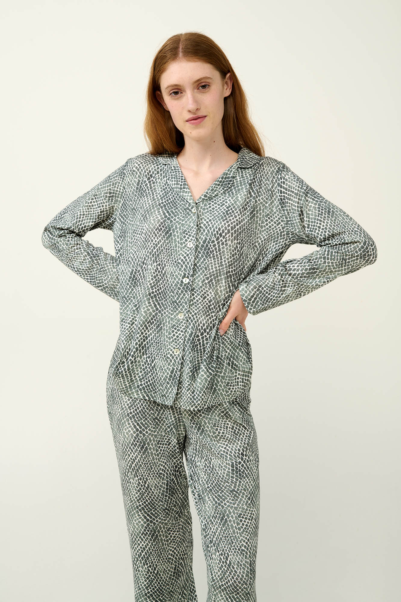 Απολαύστε στιγμές χαλάρωσης φορώντας ένα σετ χειμερινές γυναικείες πυτζάμες με εκλεπτυσμένο animal print μοτίβο σε πράσινη ανθρακί απόχρωση. Σχεδιασμένο με κλασικό κουμπωτό πάνω μέρος που χαρίζει διαχρονική γοητεία και κομψότητα. Το σετ είναι κατασκευασμένο από εξαιρετικά απαλό LENZING Tencel Modal Micro που αγκαλιάζει ευχάριστα το σώμα σας, ενώ επιτρέπει στο δέρμα να αναπνέει για να απολαύσετε κάθε στιγμή στο σπίτι.