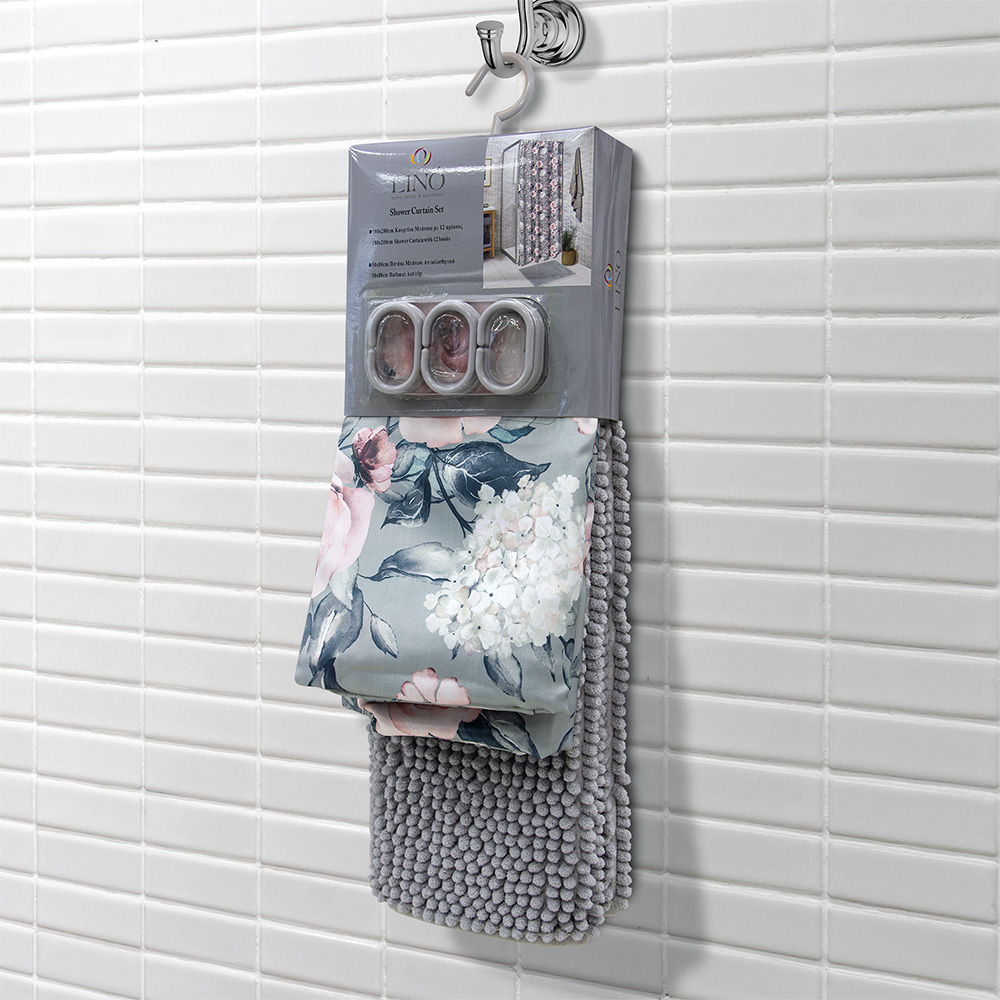 Περιλαμβάνει μία κουρτίνα μπάνιου με δώδεκα πλαστικούς κρίκους