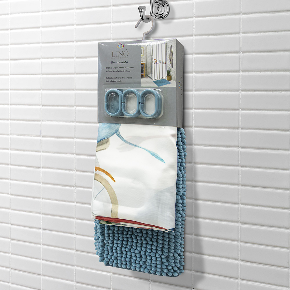 Περιλαμβάνει μία κουρτίνα μπάνιου με δώδεκα πλαστικούς κρίκους