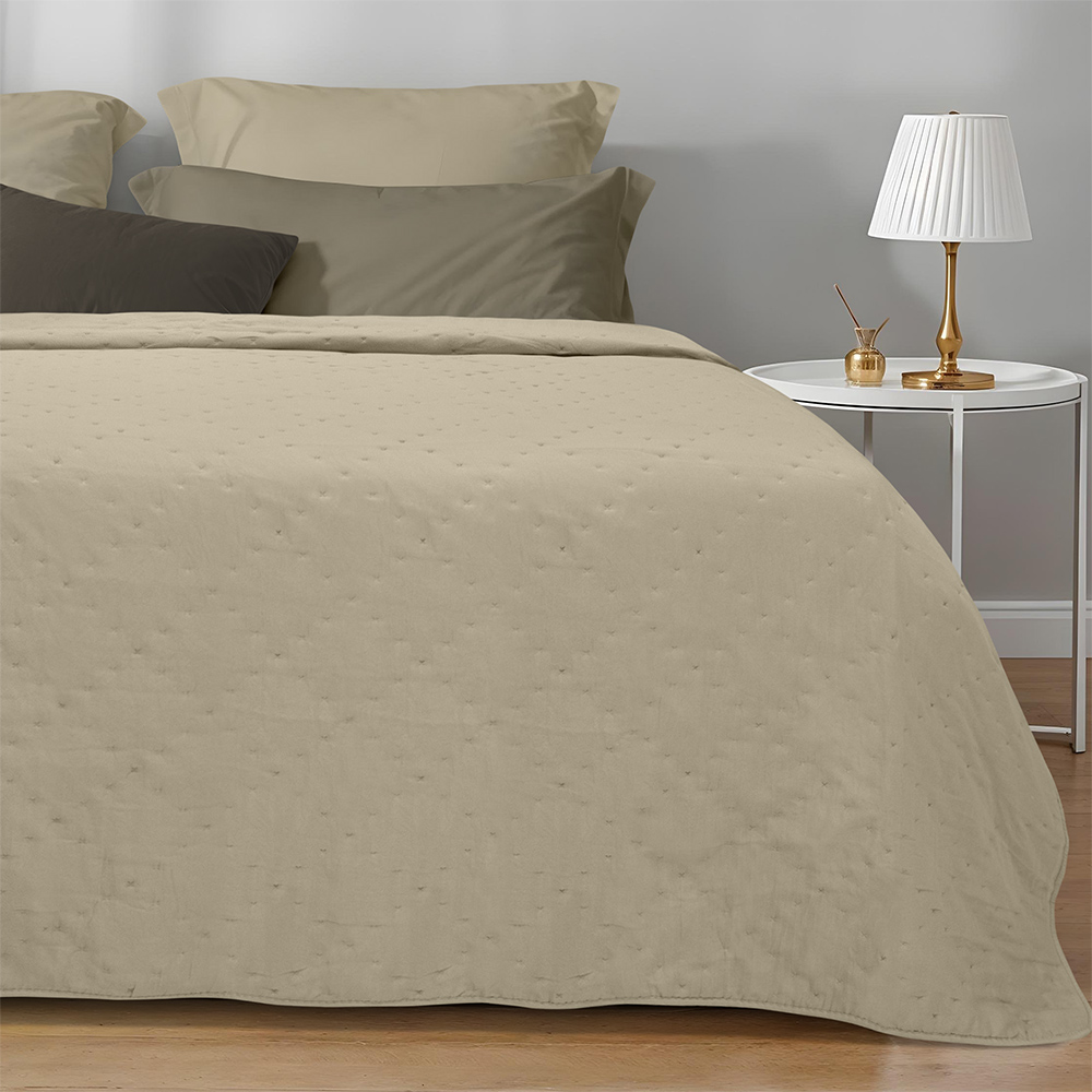 Μονό κουβερλί σε απόχρωση μπεζ με prewashed επεξεργασία για απαλή αίσθηση και μεγαλύτερη αντοχή. Το εξωτερικό ύφασμα είναι 100% microfiber (280gsm) και η γέμιση 100% polyester (100gr), προσφέροντας ανάλαφρο και δροσερό σκέπασμα. Με συνολικό βάρος (980gr), είναι ιδανικό για τους ανοιξιάτικους και καλοκαιρινούς μήνες.