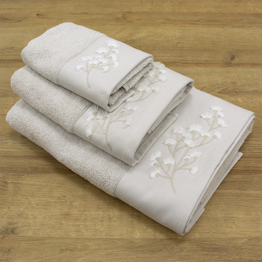Σετ πετσέτες Blom της εταιρείας Lino Home! Oι πετσέτες Blom με την ξεχωριστή τους εμφάνιση, ήρθαν για να διακοσμήσουν το μπάνιο σας με την εξαιρετική αισθητική τους. Eίναι κατασκευασμένη από 100% απαλό βαμβάκι υψηλής ποιότητας, βάρους 550gsm/m2, το οποίο προσφέρει απορροφητικότητα και την καθιστά ιδανική για καθημερινή χρήση. Συνάμα, προσφέρει και μια πινελιά πολυτέλειας στο μπάνιο σας. Διαθέτει κεντημένη φάσα με minimal floral σχέδιο, που προσδίδει ένα  διακριτικό και κομψό χαρακτήρα. Οι απαλές της αποχρώσεις καθώς και οι λεπτομέρειες του κεντήματος, δημιουργούν μία αίσθηση φινέτσας, έτοιμα να ντύσουν κλασικά και μοντέρνα μπάνια.