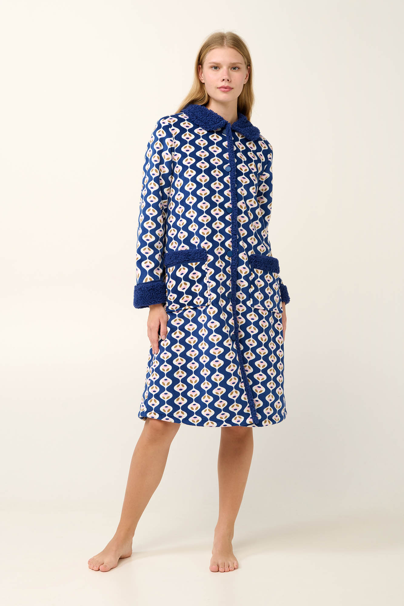 Αποκτήστε μια μακριά γυναικεία ρόμπα σε μπλε αποχρώσεις με ρουστίκ μοτίβο. Κατασκευασμένη από εξαιρετικά απαλό στο σώμα fleece, κλείνει με κουμπιά, έχει πρακτικές τσέπες που σας βοηθούν να κρατήσετε κοντά τα προσωπικά σας αντικείμενα και γιακά που δίνει κλασική κομψότητα στο σύνολο σας. Συνδυάστε τη με την αγαπημένη σας πυτζάμα για ένα ζεστό και ξεκούραστο απόγευμα στον καναπέ.