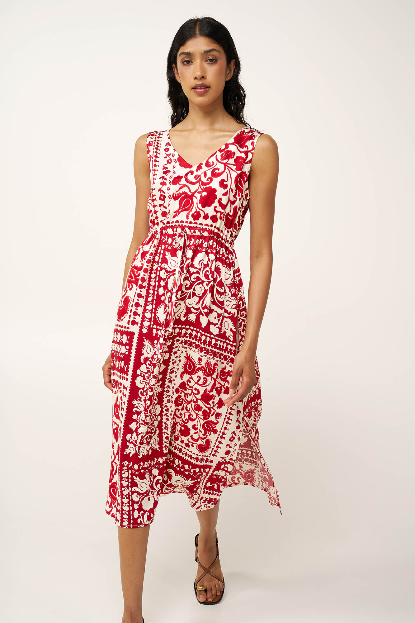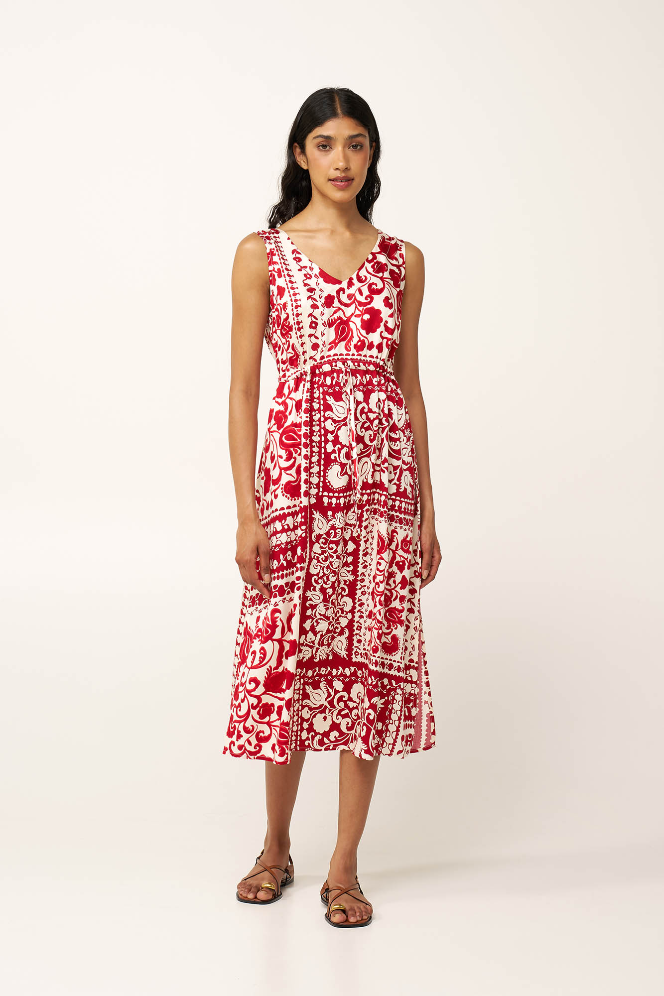 Σχεδιασμένο για ηλιόλουστες μέρες, αυτό το καλοκαιρινό φόρεμα είναι κατασκευασμένο από 100% viscose ποπλίνα, προσφέροντας διαπνέουσα και ανάλαφρη αίσθηση στη δέρμα. Η θηλυκή V λαιμόκοψη δημιουργεί μια κολακευτική σιλουέτα, ενώ ένα λάστιχο στη μέση επιτρέπει να προσαρμόζετε την εφαρμογή στο σώμα. Τα διακριτικά ανοίγματα στο πλάι προσθέτουν άνεση και ελευθερία κινήσεων, ενώ ένα μωσαϊκό από παραδοσιακά μοτίβα σε κόκκινο τερακότα, το κάνουν μια εύκολη επιλογή για κάθε στιγμή του καλοκαιριού, από το πρωί μέχρι το βράδυ.