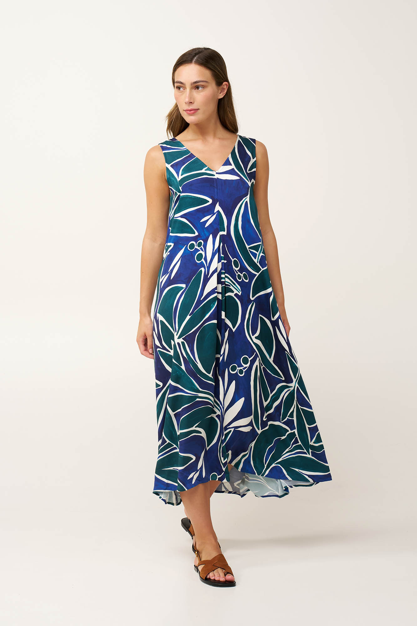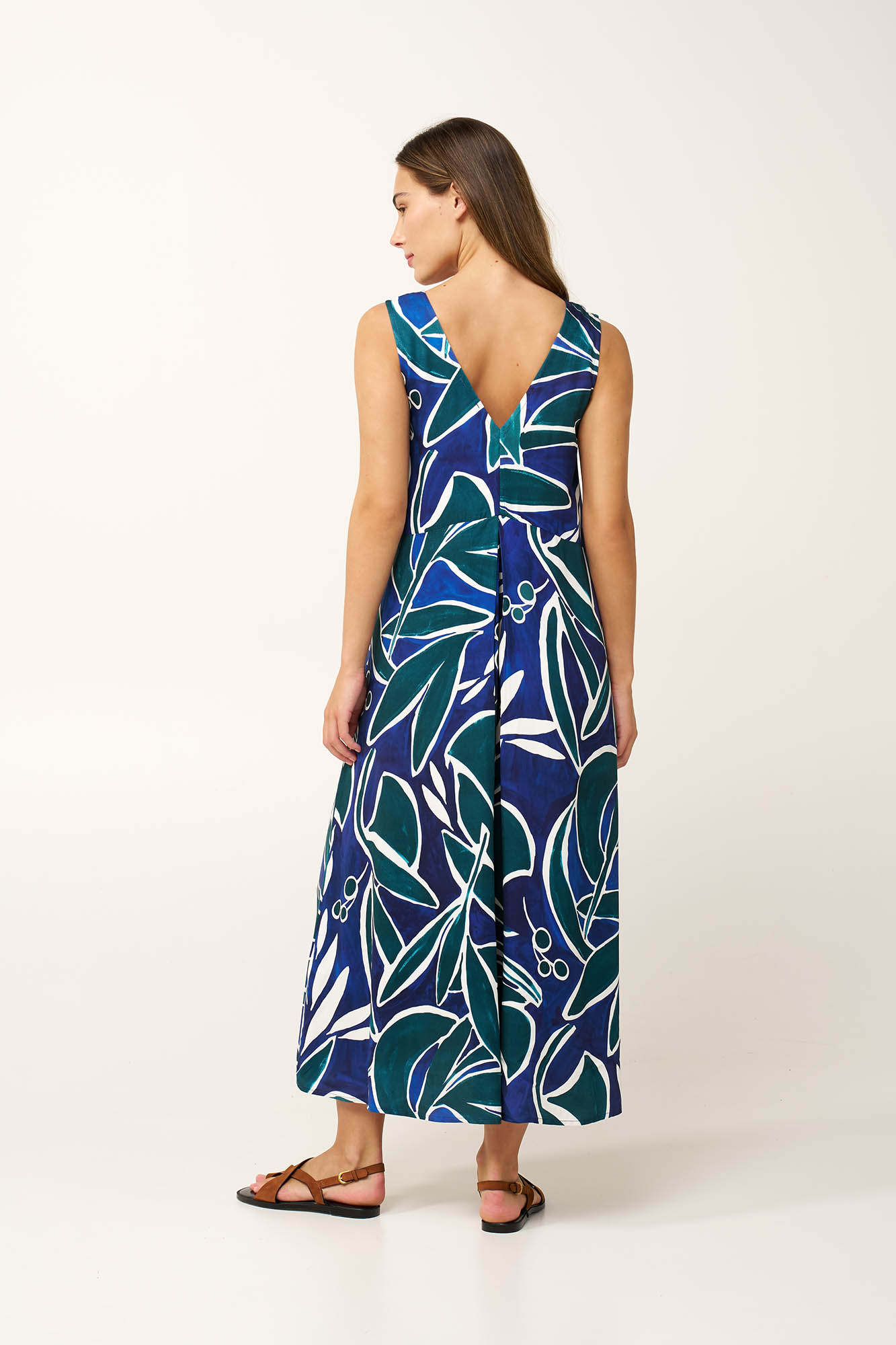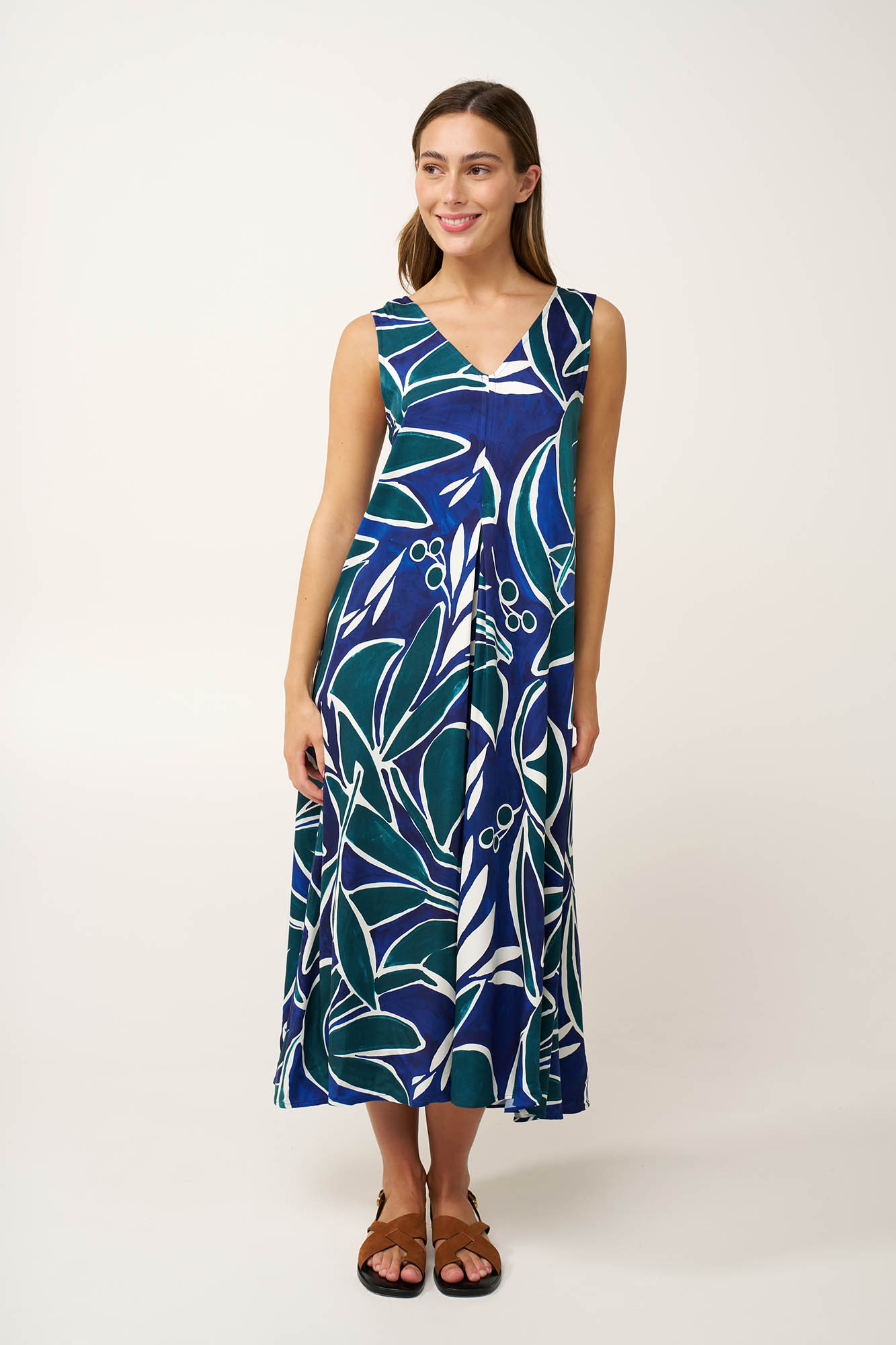 Προσθέστε στην γκαρνταρόμπα σας, ένα μακρύ καλοκαιρινό φόρεμα από 100% viscose ποπλίνα. Η V λαιμόκοψη χαρίζει θηλυκότητα, ενώ οι πιέτες μπροστά και πίσω δίνουν άνεση και ενισχύουν τη φυσική κίνηση του φορέματος. έντονο γραφικό print με αφηρημένα σχήματα σε ωκεάνιους τόνους προσθέτει βάθος και σύγχρονο χαρακτήρα. Επιβλητικό και εκφραστικό, είναι σχεδιασμένο να κινείται με χάρη σε κάθε σας βήμα και να ξεχωρίζει σε κάθε καλοκαιρινή casual περίσταση.