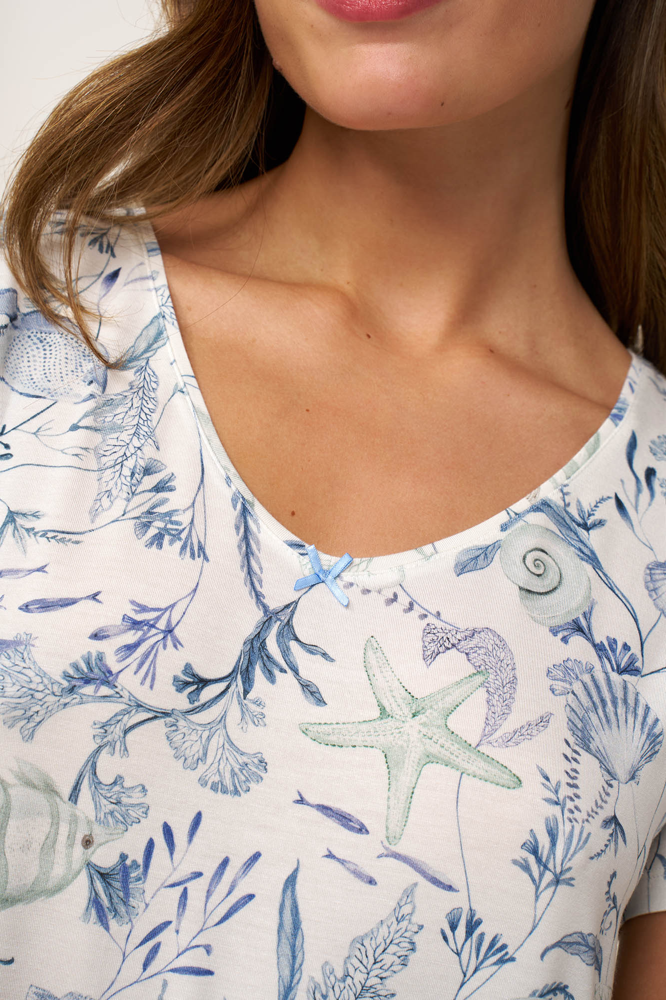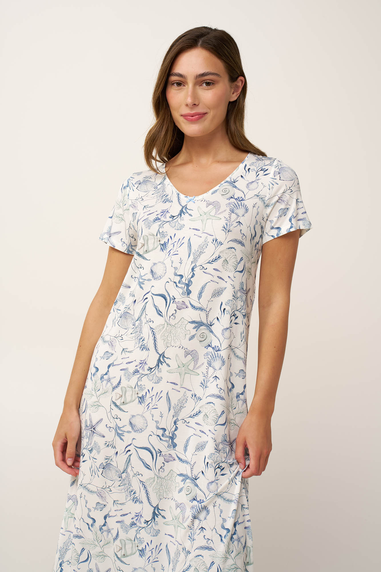 Απολαύστε αβίαστη άνεση με αυτό το μακρύ καλοκαιρινό νυχτικό με κοντά μανίκια, σχεδιασμένο για ήρεμες και ξεκούραστες νύχτες. Κατασκευασμένο από διαπνέον LENZING Tencel Modal Micro με elastane, χαρίζει εξαιρετικά απαλή αίσθηση, και όμορφη, χαλαρή εφαρμογή στο σώμα. Το μοτίβο με κοράλλια, κοχύλια και θαλάσσια φυτά σε γαλήνιες μπλε αποχρώσεις χαρίζει φρεσκάδα και ηρεμία κάνοντας το ιδανικό για χαλάρωση ή το βραδινό σας ύπνο.