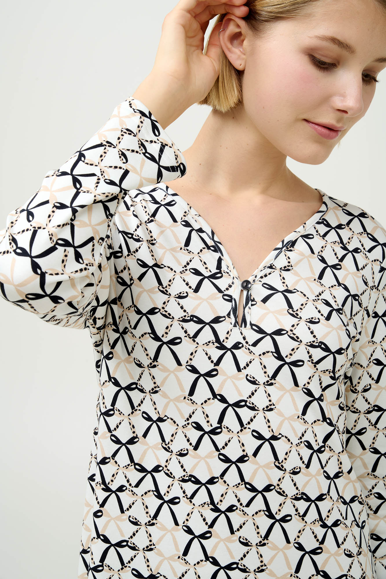 Απολαύστε απαράμιλλη άνεση κατά τη διάρκεια της νύχτας με αυτό το μακρύ νυχτικό, φτιαγμένο από 100% βαμβάκι interlock που χαρίζει απαλή και διαπνέουσα αίσθηση στο δέρμα. Σχεδιασμένο με μακριά μανίκια σε άνετη γραμμή, με κομψό μοτίβο φιόγκων που ενισχύει τον κλασικό του χαρακτήρα. Ιδανικό για χαλάρωση ή ύπνο, προσφέροντάς σας μια ζεστή και κομψή επιλογή για τα βράδια του χειμώνα.