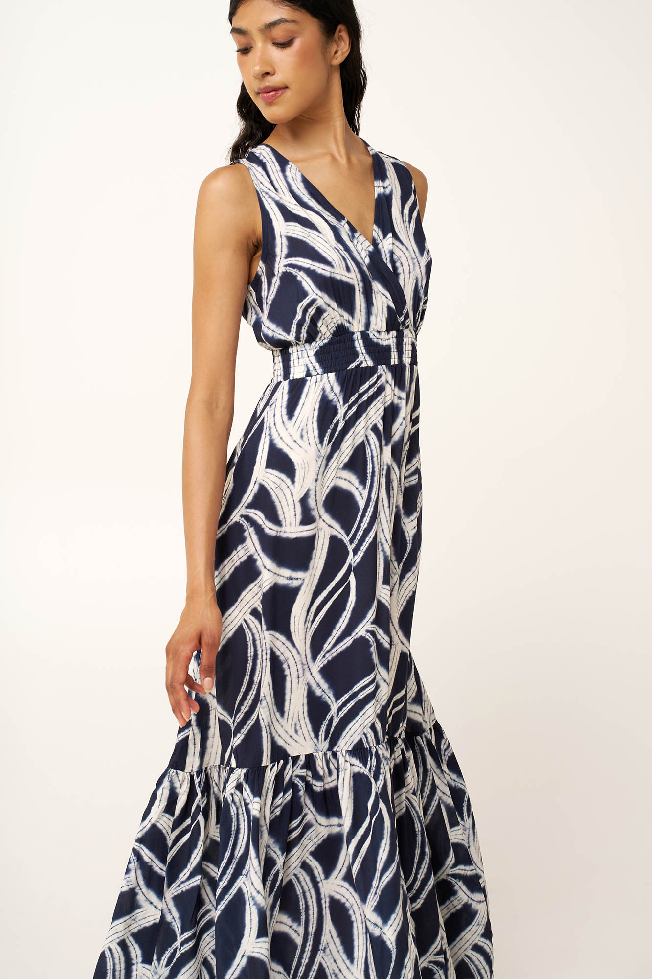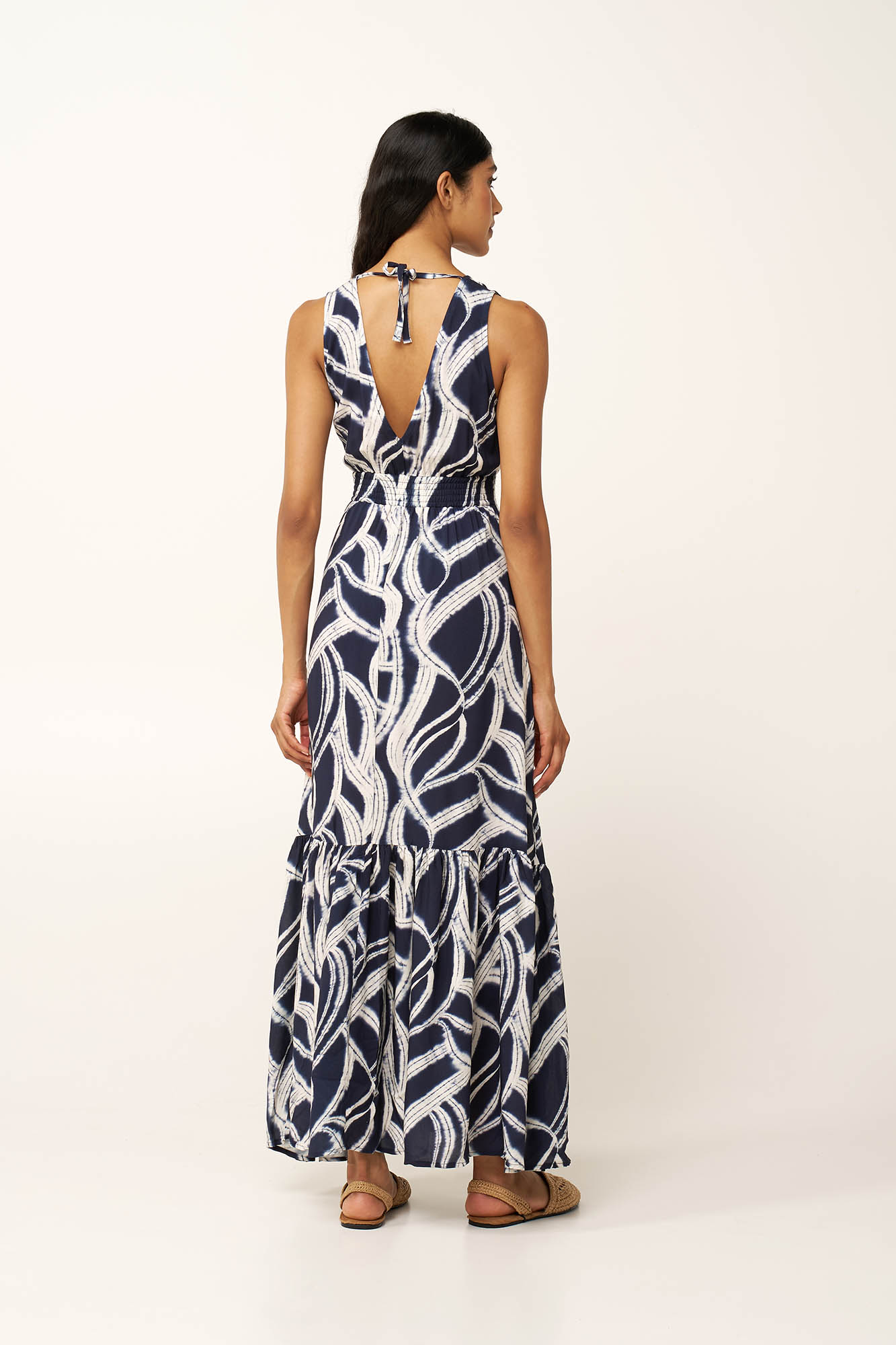 Προσθέστε στην γκαρνταρόμπα σας αυτό το καλοκαιρινό maxi φόρεμα, κατασκευασμένο από 100% viscose ποπλίνα. Η V λαιμόκοψη μπροστά και πίσω χαρίζει θηλυκότητα,, ενώ η ελαστική μέση τονίζει και σχηματίζει τη σιλουέτα. Το αφηρημένο εκρού μοτίβο πάνω σε βαθύ μπλε καμβά, δίνει φινέτσα και αυτοπεποίθηση. Ιδανικό για εξορμήσεις στην παραλία, καλοκαιρινές συναντήσεις ή ηλιόλουστα απογεύματα, αυτό το φόρεμα συνδυάζει ανεπιτήδευτη κομψότητα και κίνηση.