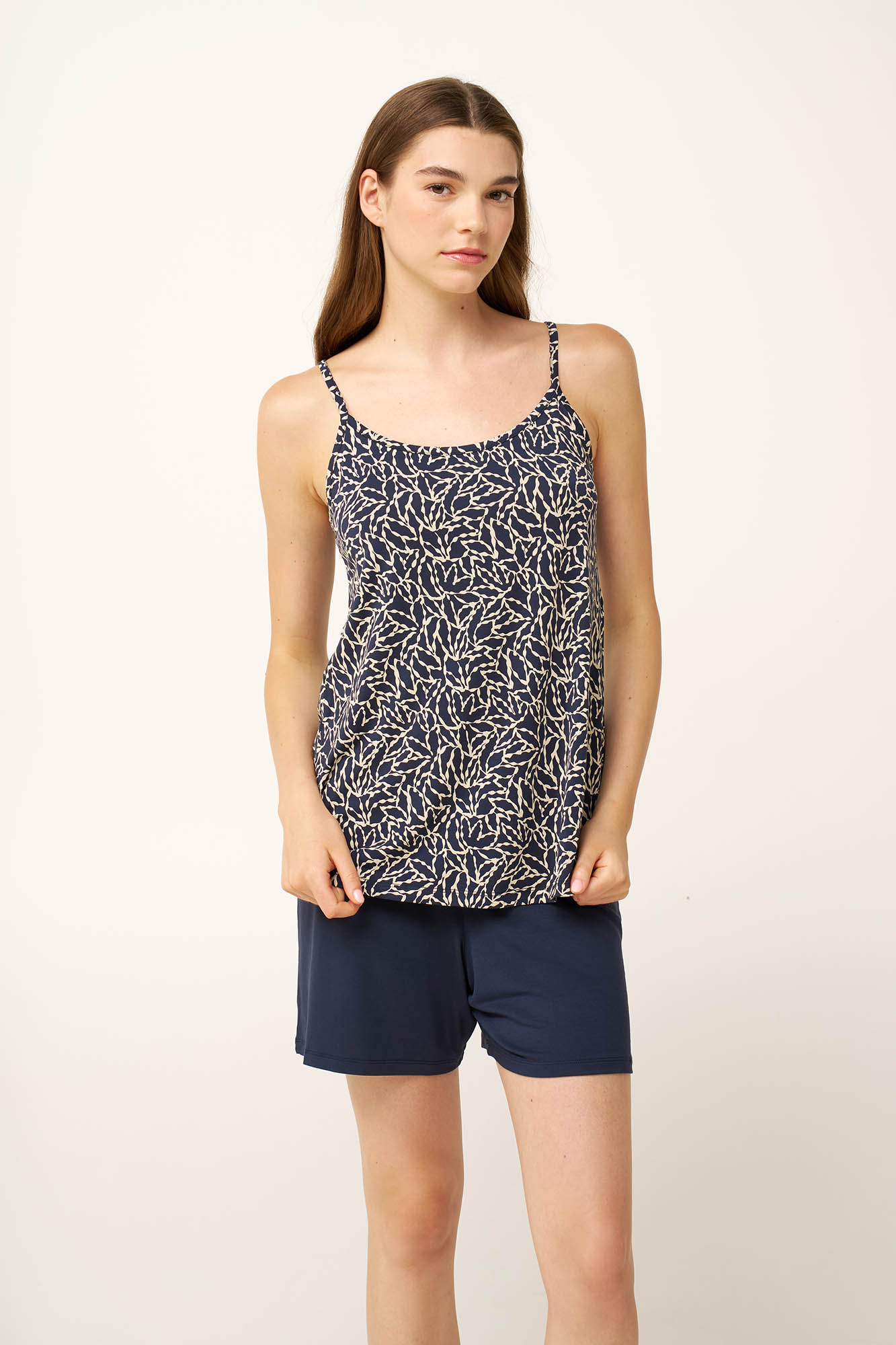 Ένα ανάλαφρο και δροσερό baby doll, κατασκευασμένο από εξαιρετικά απαλό και διαπνέον LENZING Tencel Modal Micro είναι ό,τι χρειάζεστε τις ζεστές καλοκαιρινές ημέρες. Αποτελείται από ένα τοπ με λεπτές τιράντες, διακοσμημένο με ένα εντυπωσιακό φλοράλ μοτίβο σε βαθύ μπλε καμβά και ένα μονόχρωμο παντελόνι που χαρίζει ισορροπία στο σύνολο. Απολαύστε ένα χαλαρό πρωινό στις διακοπές σας ή τον βραδινό σας ύπνο με θηλυκότητα και άνεση.