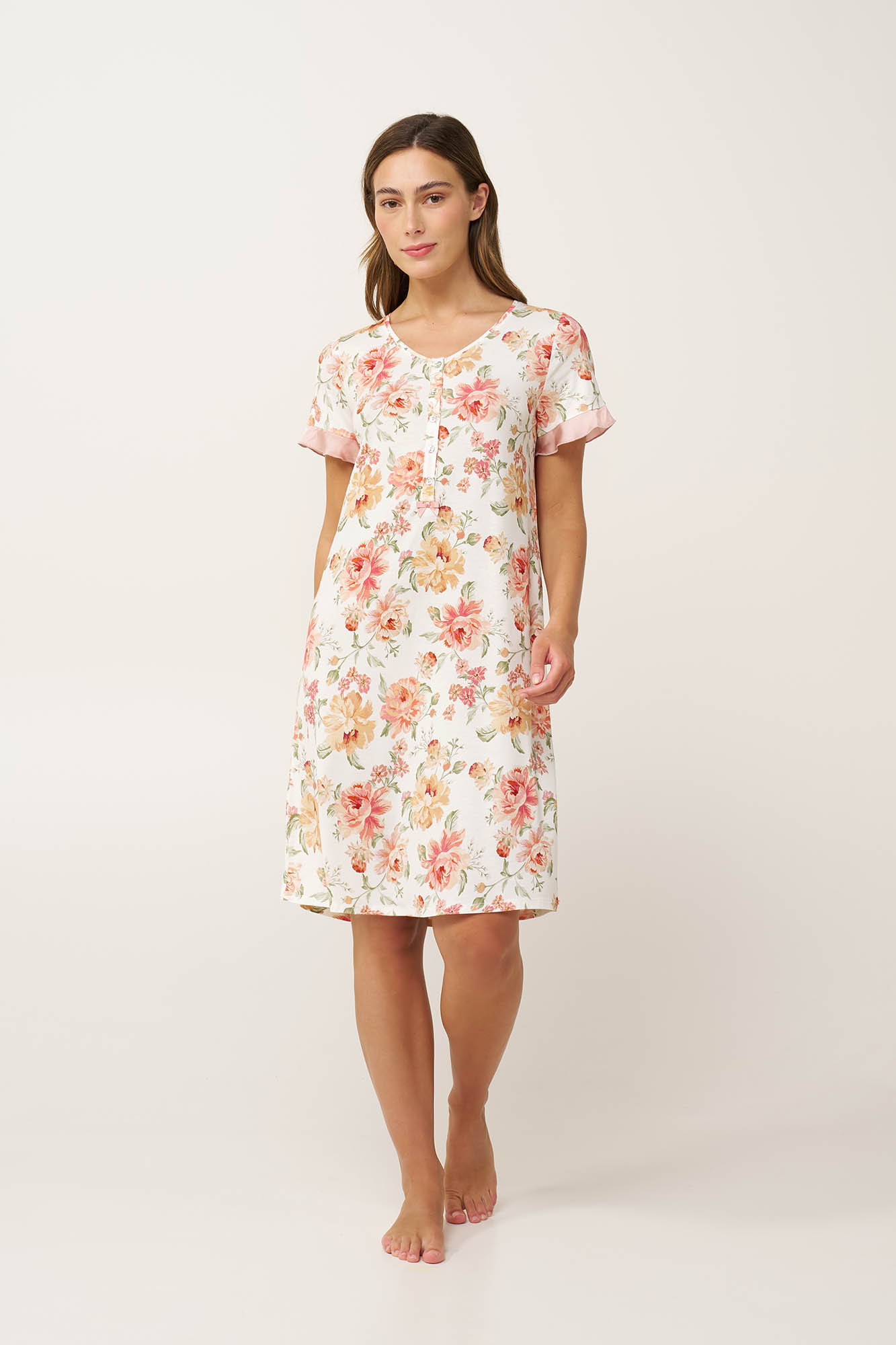 Προσθέστε στη γκαρνταρόμπα σας ένα καλοκαιρινό νυχτικό με vintage φλοράλ μοτίβο, κατασκευασμένο από LENZING Tencel Modal Micro για απαλή και πολυτελή αίσθηση στο δέρμα. Σχεδιασμένο με κοντά μανίκια διακοσμημένα με σιφόν και κλασική πατιλέτα που μπορεί να βοηθήσει το θηλασμό. Ελαφρύ και με χαλαρή εφαρμογή, προσφέρει δροσερή, διαπνέουσα άνεση στις ζεστές καλοκαιρινές νύχτες.