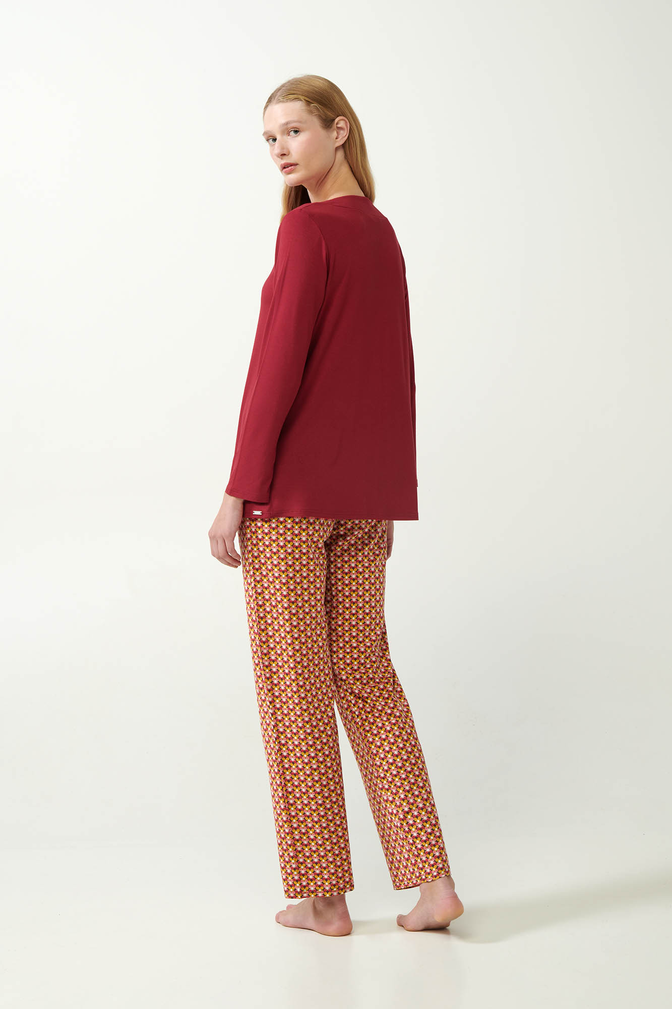 Προσθέστε στη συλλογή σας ένα κομψό σετ γυναικείες πυτζάμες. Αποτελείται από μπλούζα με λαιμόκοψη V και πιέτα για μεγαλύτερη αίσθηση ελευθερίας σε μια εντυπωσιακή κόκκινη απόχρωση. Συνδυάζεται αρμονικά με ένα παντελόνι σε γεωμετρικό φλοράλ μοτίβο. Κατασκευασμένες σε χαλαρή γραμμή από μαλακό micromodal που επιτρέπει στο σώμα να αναπνέει. Ένας ιδανικός συνδυασμός άνεσης και πολυτέλειας που πρέπει να έχετε στη ντουλάπα σας.