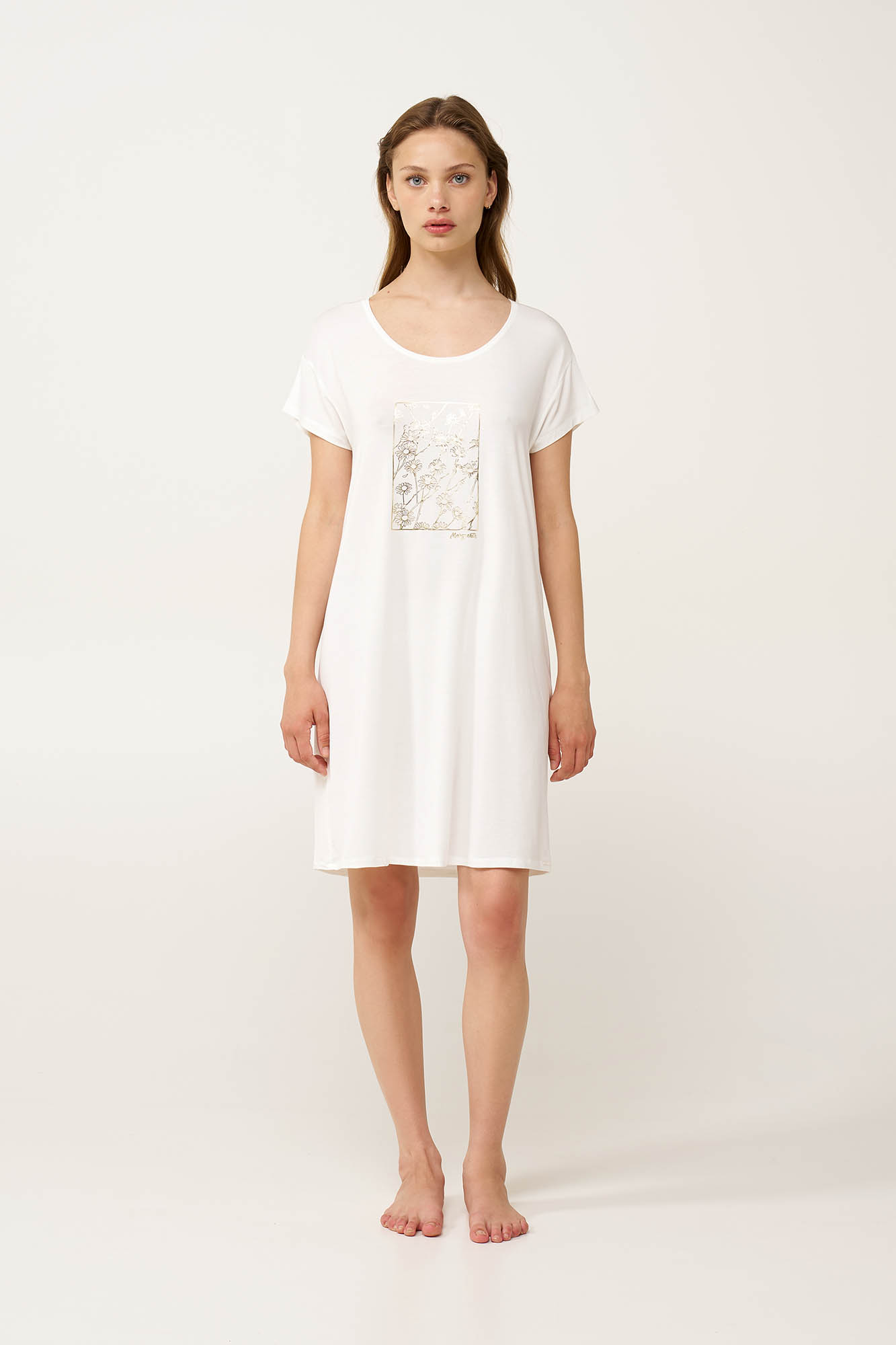 Απολαύστε αέρινη καλοκαιρινή κομψότητα με αυτό το νυχτικό, κατασκευασμένο από LENZING Tencel Modal Micro για απαλή, διαπνέουσα και ελαφριά αίσθηση στο σώμα. Σχεδιασμένο με διακριτικές χρυσές μαργαρίτες στο στήθος, που προσθέτουν μια εκλεπτυσμένη νότα και χαλαρή εφαρμογή που εξασφαλίζει άνεση και ελευθερία κινήσεων είναι ιδανικό για ξεχωριστές στιγμές χαλάρωσης στο σπίτι ή τις καλοκαιρινές διακοπές.