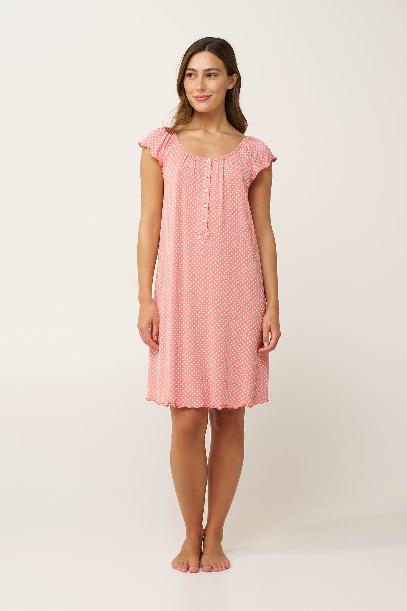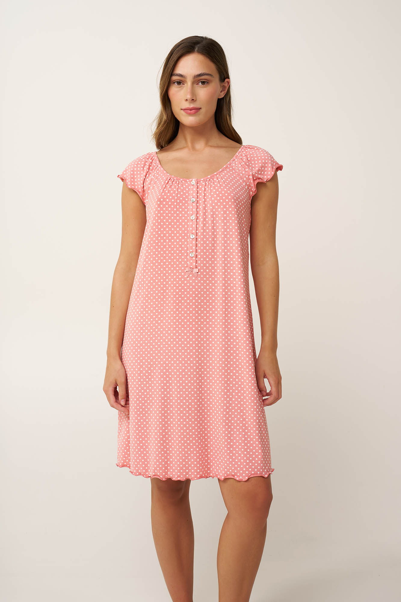 Χαλαρώστε με ανάλαφρη διάθεση φορώντας αυτό το καλοκαιρινό νυχτικό, φτιαγμένο από LENZING Tencel Modal Micro με δροσερή και εξαιρετικά απαλή αίσθηση. Είναι σχεδιασμένο με πατιλέτα στο στήθος σε χαλαρή γραμμή και λευκό πουά πάνω σε ροζ- καμβά που προσθέτει μια γλυκιά, νότα. Ρομαντικό και διαχρονικό, είναι μια ιδανική επιλογή για ήσυχα απογεύματα και ξεκούραστα βράδια.