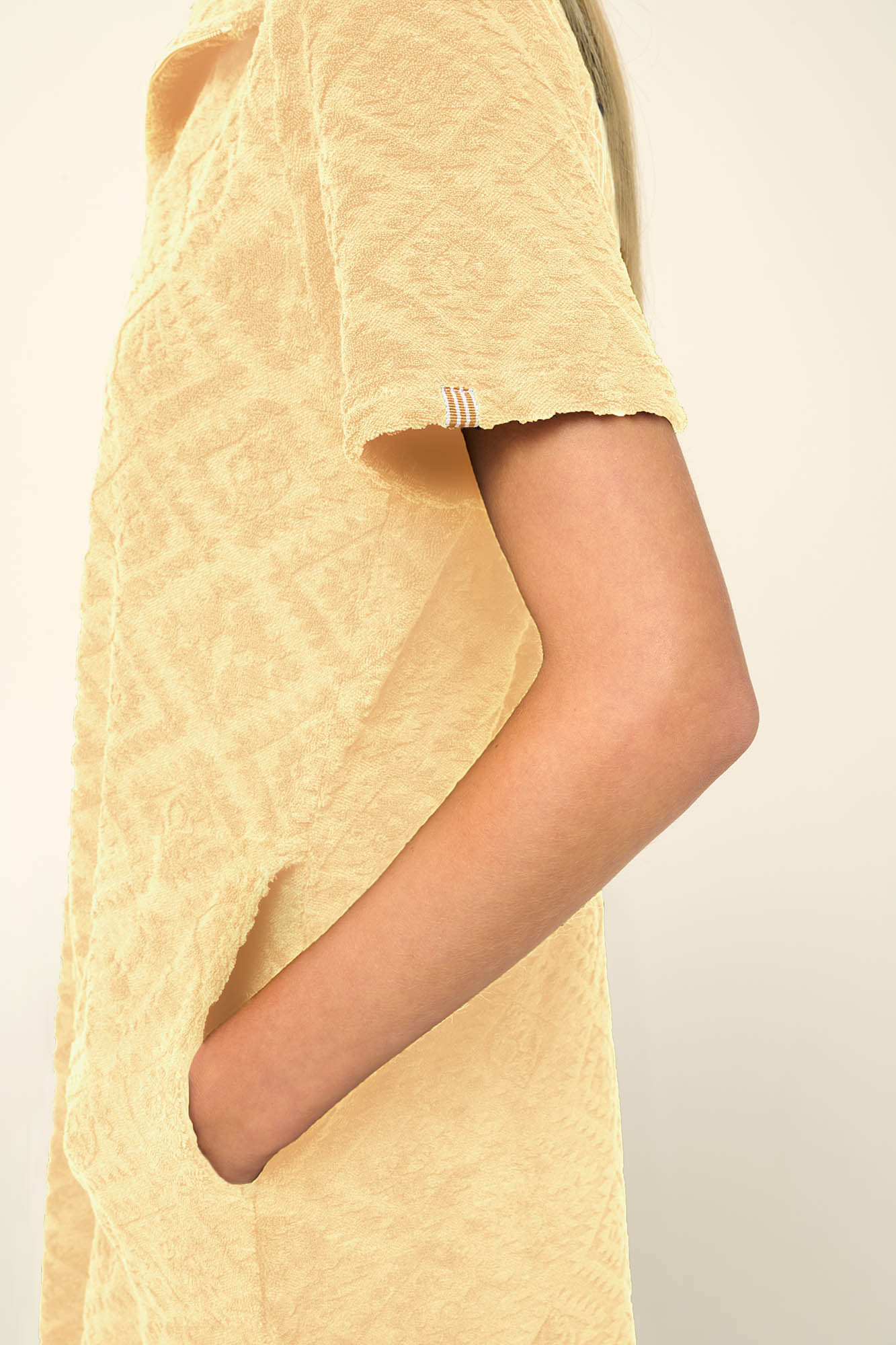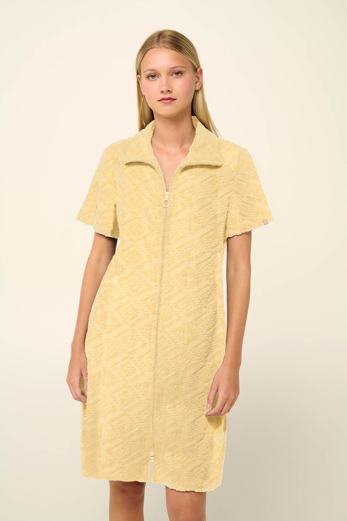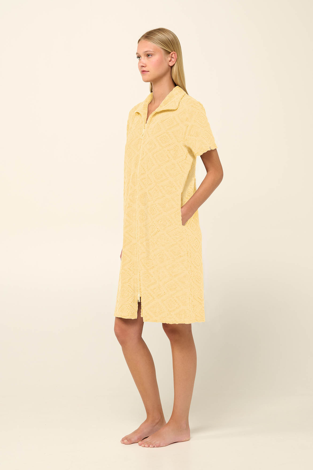 Προσθέστε στις αποσκευές σας ένα μονόχρωμο ανάγλυφο frottee φόρεμα θαλάσσης, κατασκευασμένο από ύφασμα με υψηλή περιεκτικότητα σε βαμβάκι που προσφέρει εξαιρετική απορροφητικότητα και διαπνοή. Διαθέτει φερμουάρ σε όλο το μήκος μπροστά, κοντά μανίκια με διακριτικές διάτρητες λεπτομέρειες και άνετη εφαρμογή. Οι τσέπες στο πλάι προσθέτουν πρακτικότητα, καθιστώντας το ιδανικό για την παραλία ή την πισίνα.