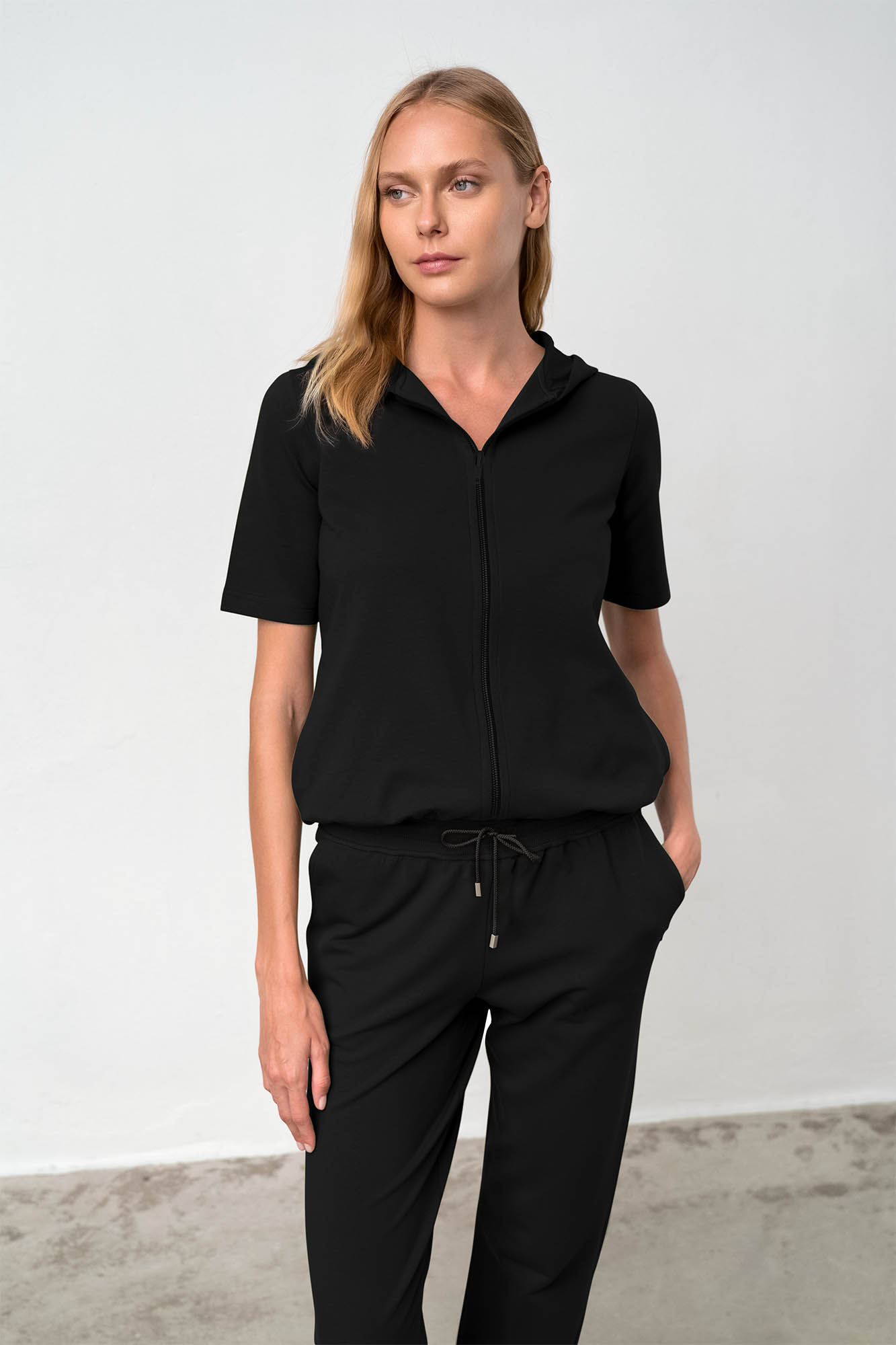 Αθλητική, γυναικεία ζακέτα με κουκούλα και φερμουάρ. Μια χαλαρή επιλογή για τη βόλτα σας ή για γυμναστική. Συνδυάζεται ιδανικά με προϊόντα της ίδιας σειράς.