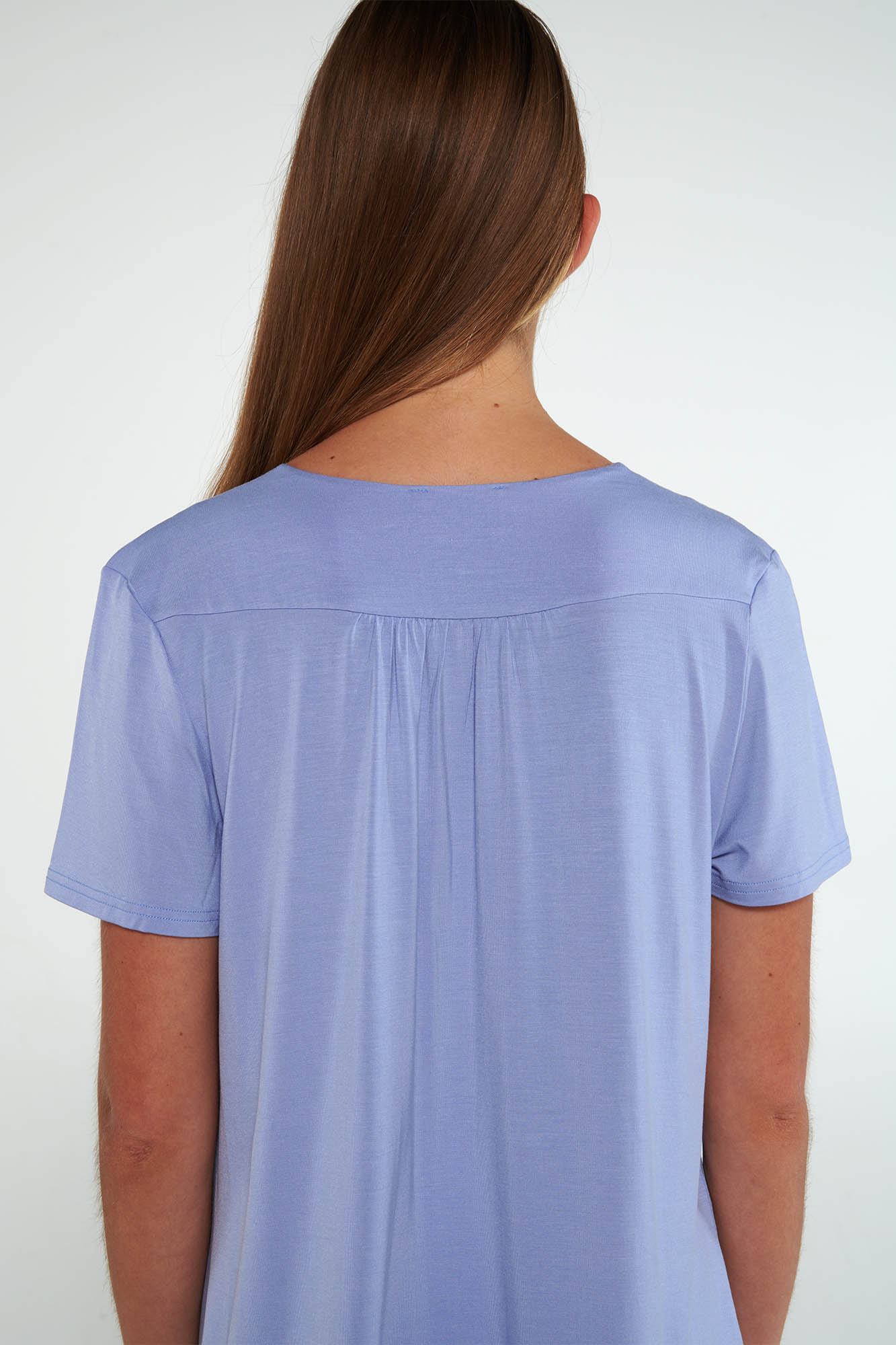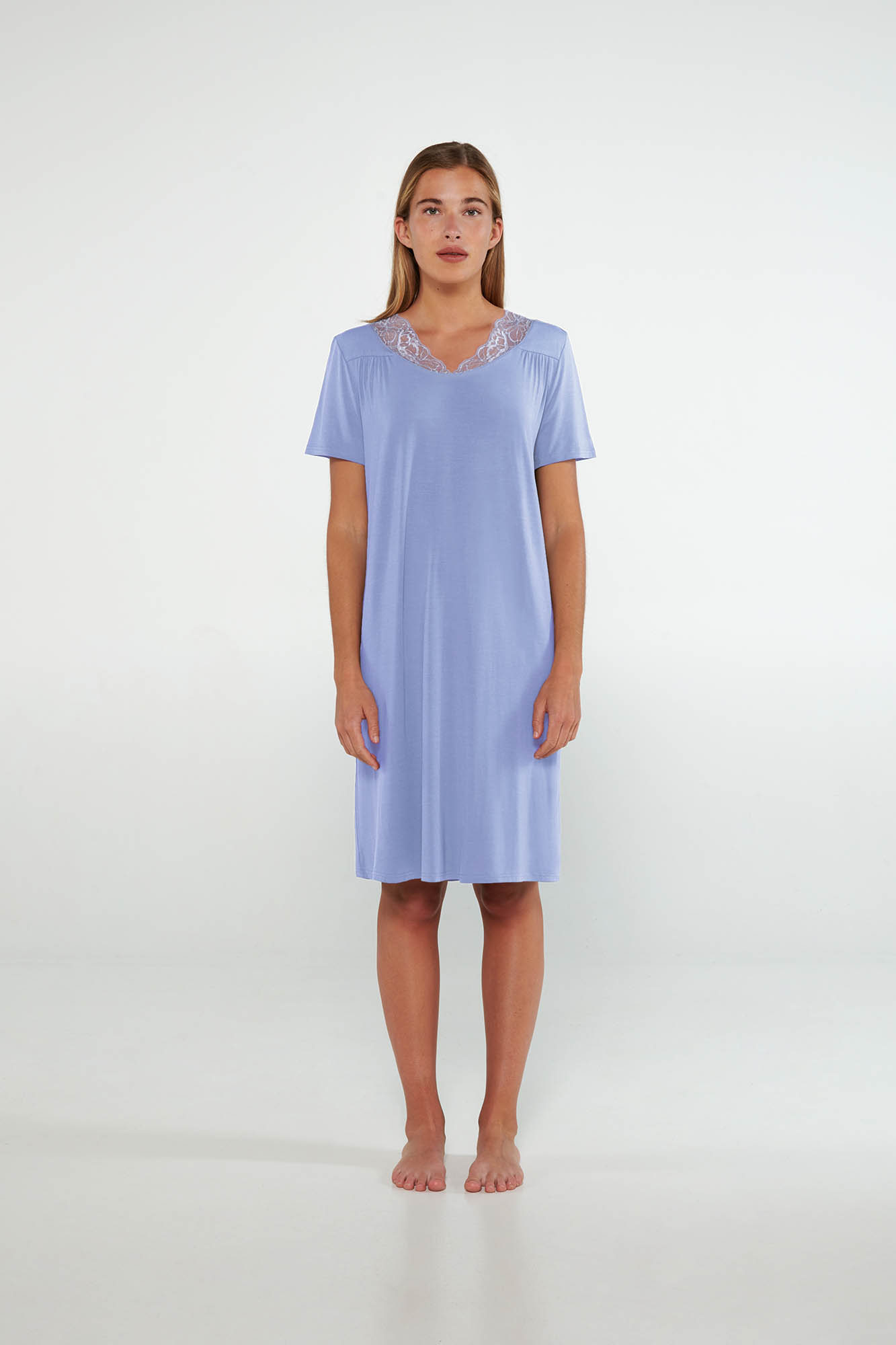 Νυχτικό με κοντό μανίκι και λαιμόκοψη με δαντέλα, σε χαλαρή γραμμή. Διαχρονική, μονόχρωμη κομψότητα.