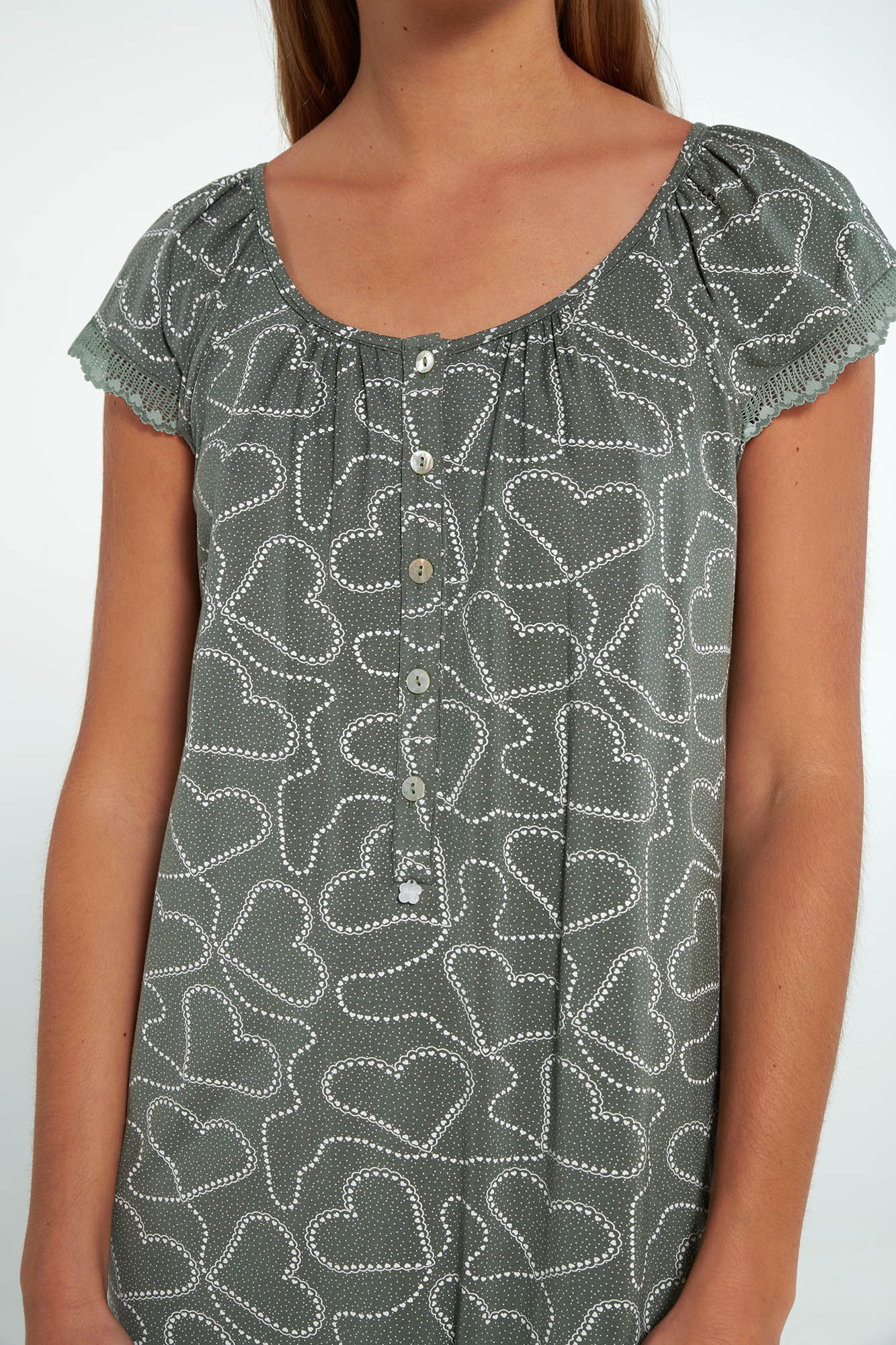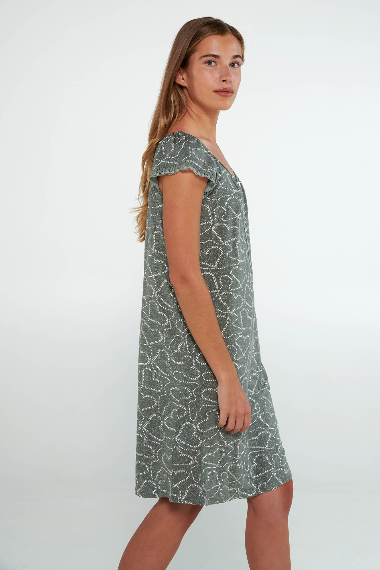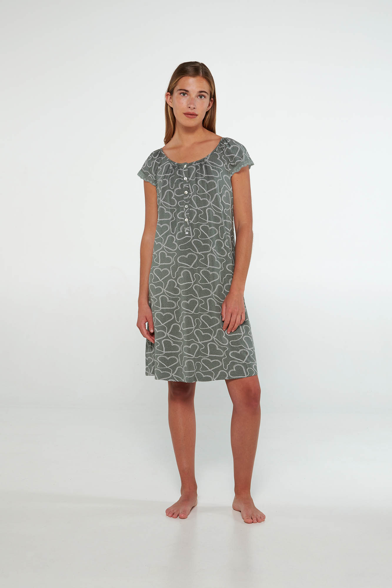 Νυχτικό με κοντό μανίκι και πατιλέτα σε χαλαρή γραμμή. Ένα χαριτωμένο, εμπριμέ σχέδιο σε γήινες αποχρώσεις.