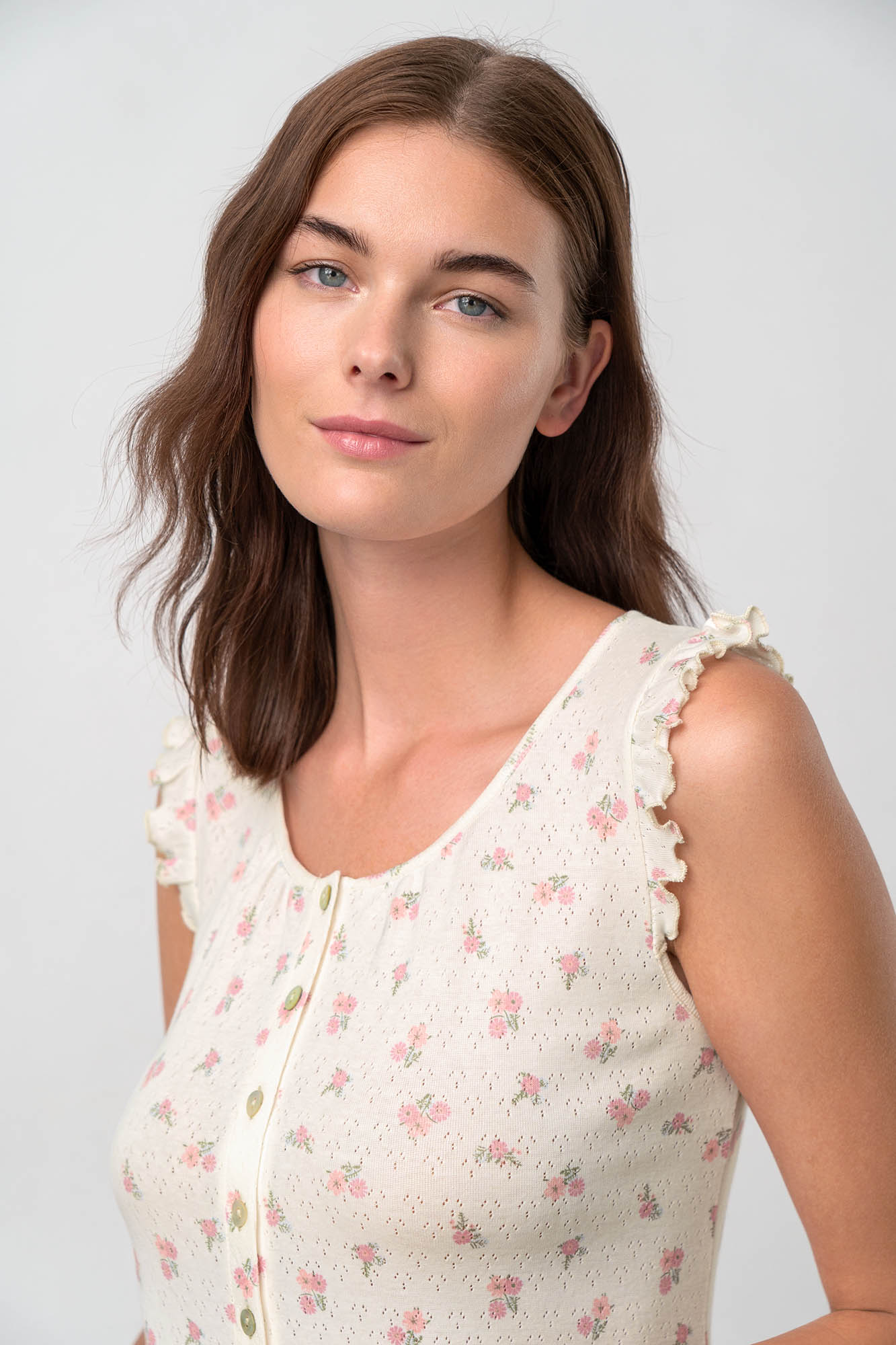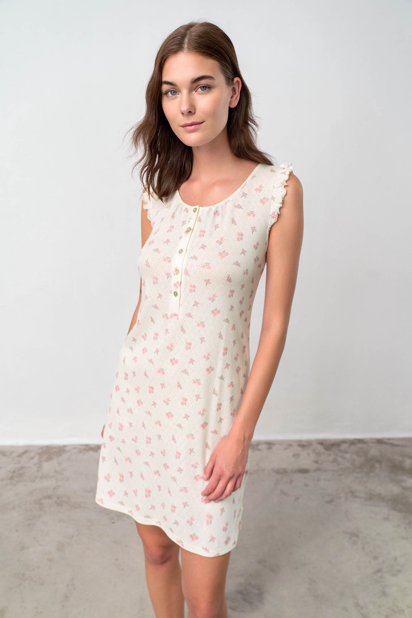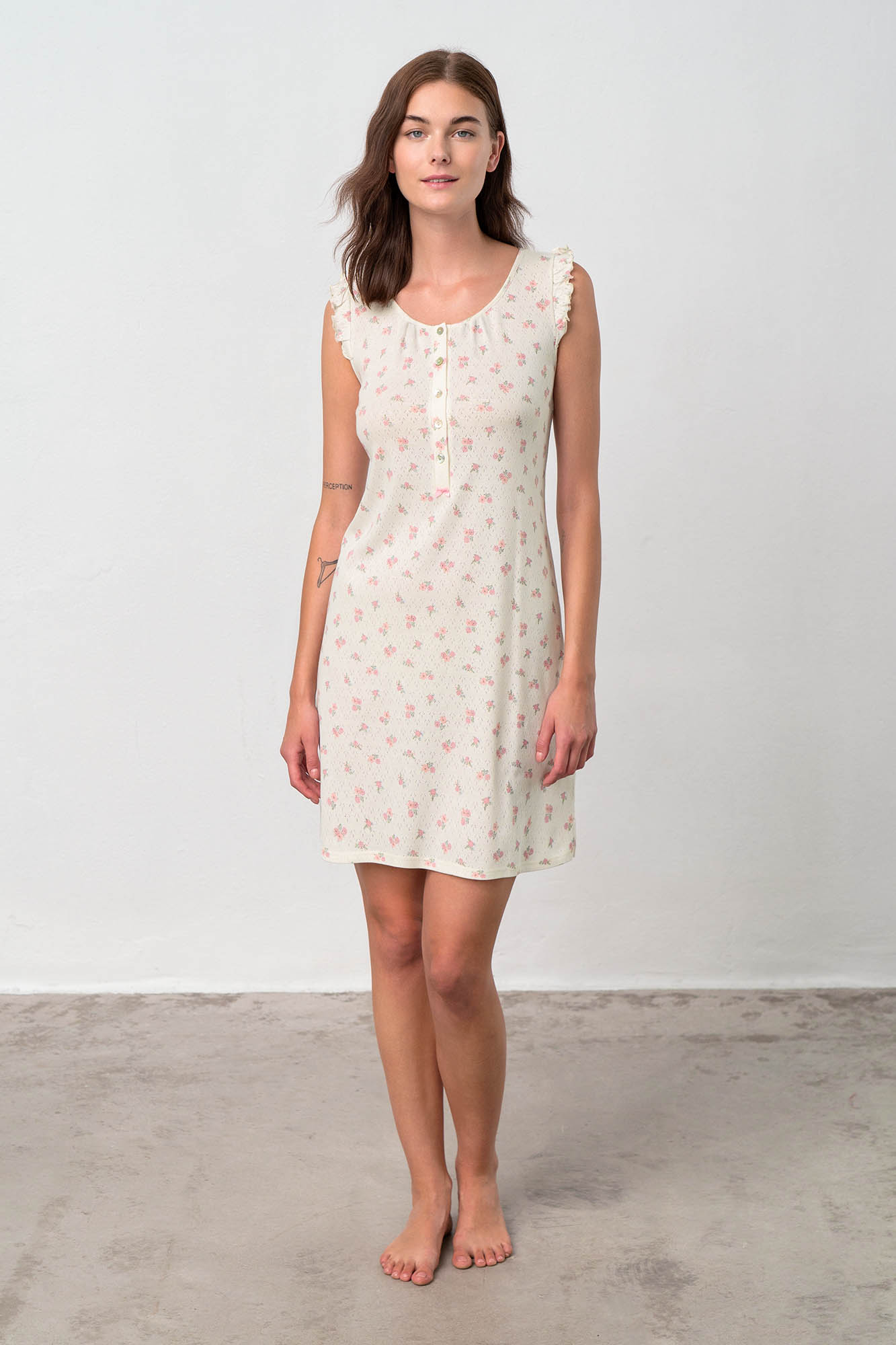Αμάνικο, εμπριμέ νυχτικό με πατιλέτα και στρογγυλή λαιμόκοψη. Ένα κλασικό φλοράλ σχέδιο, από δροσερό βαμβάκι που προσφέρει άνεση όλες τις ώρες της ημέρας.