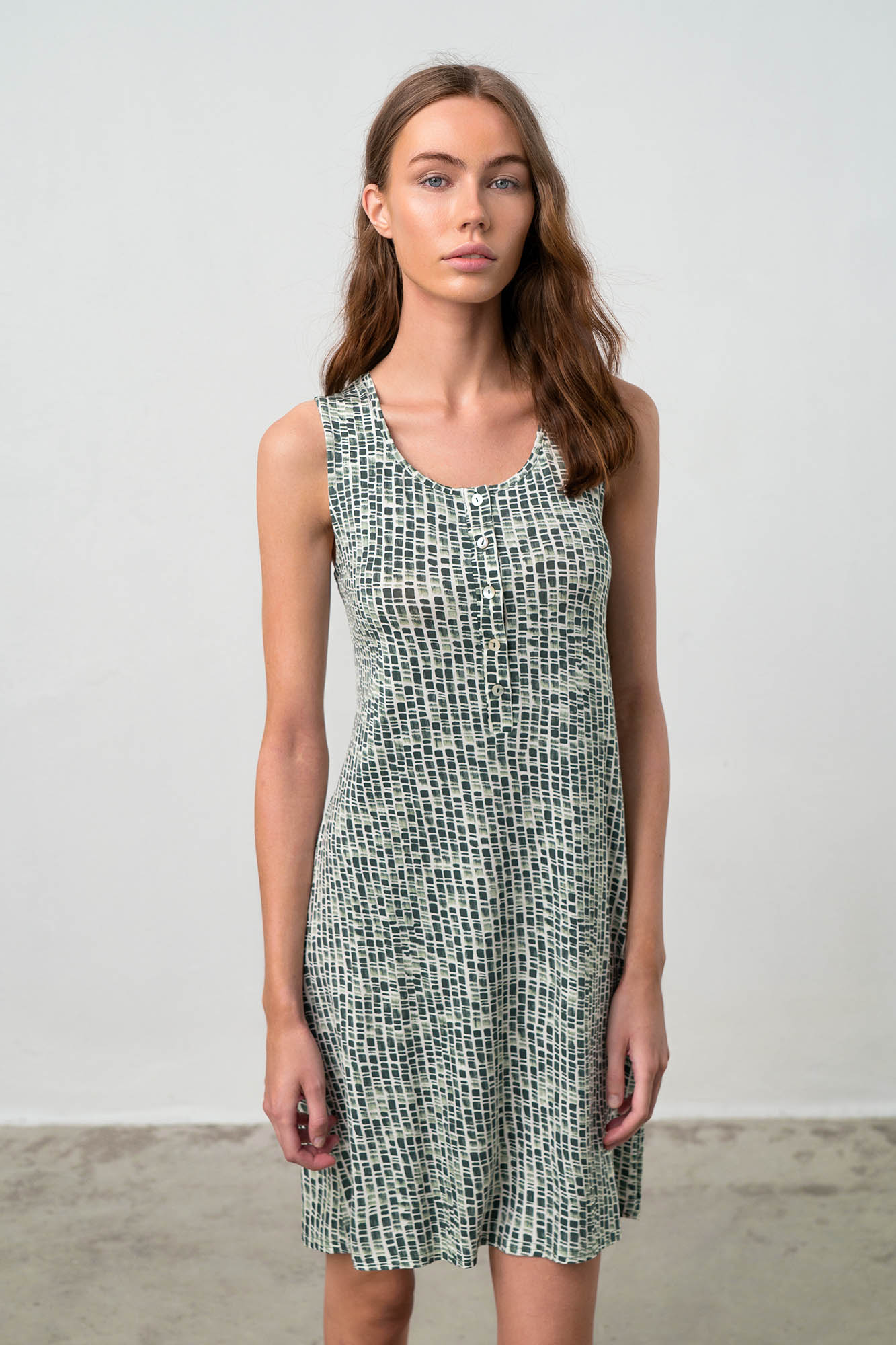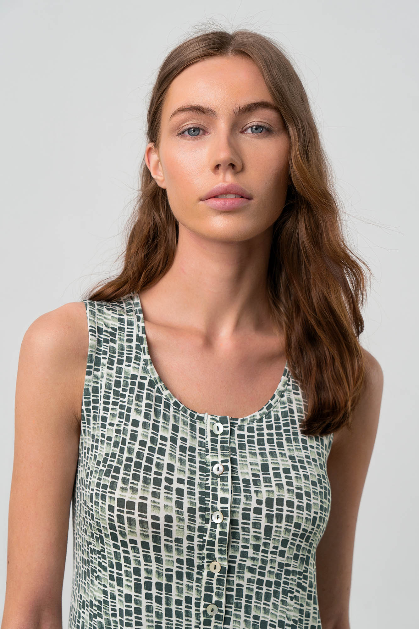 Αμάνικο νυχτικό με πατιλέτα σε χαλαρή γραμμή. Ένα ιδιαίτερο εμπριμέ σχέδιο σε πράσινη απόχρωση για κάθε καλοκαιρινή ημέρα.