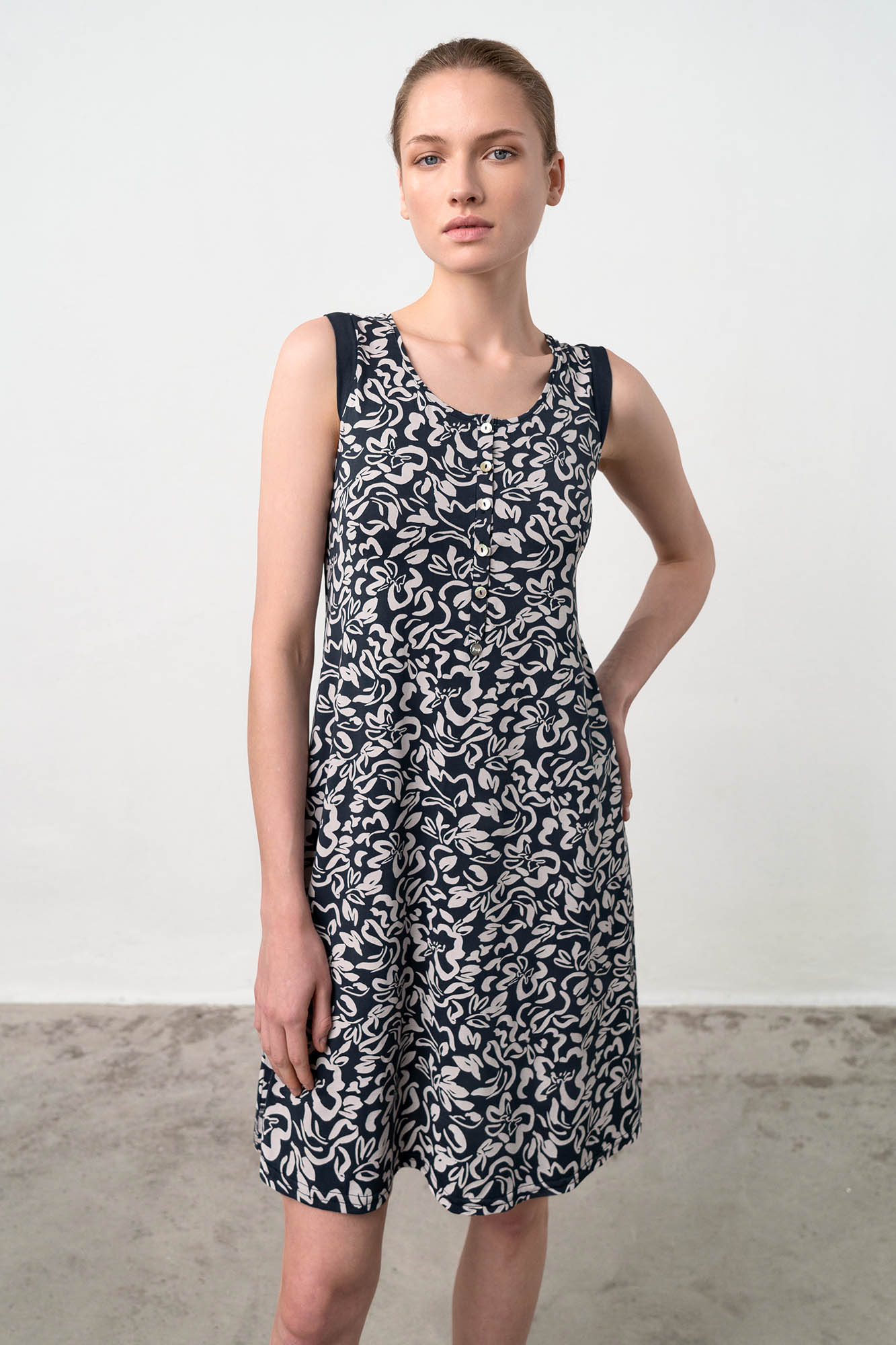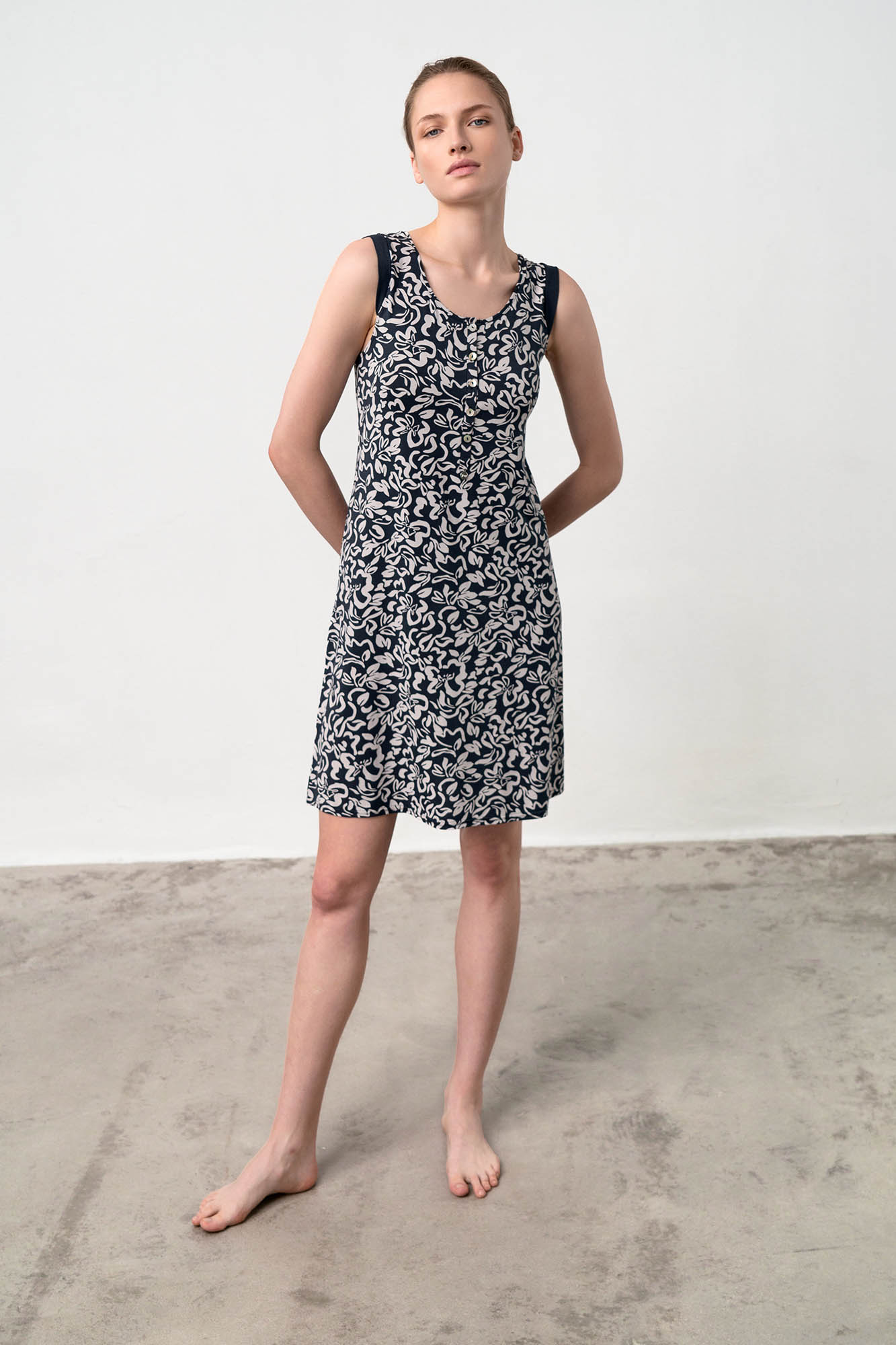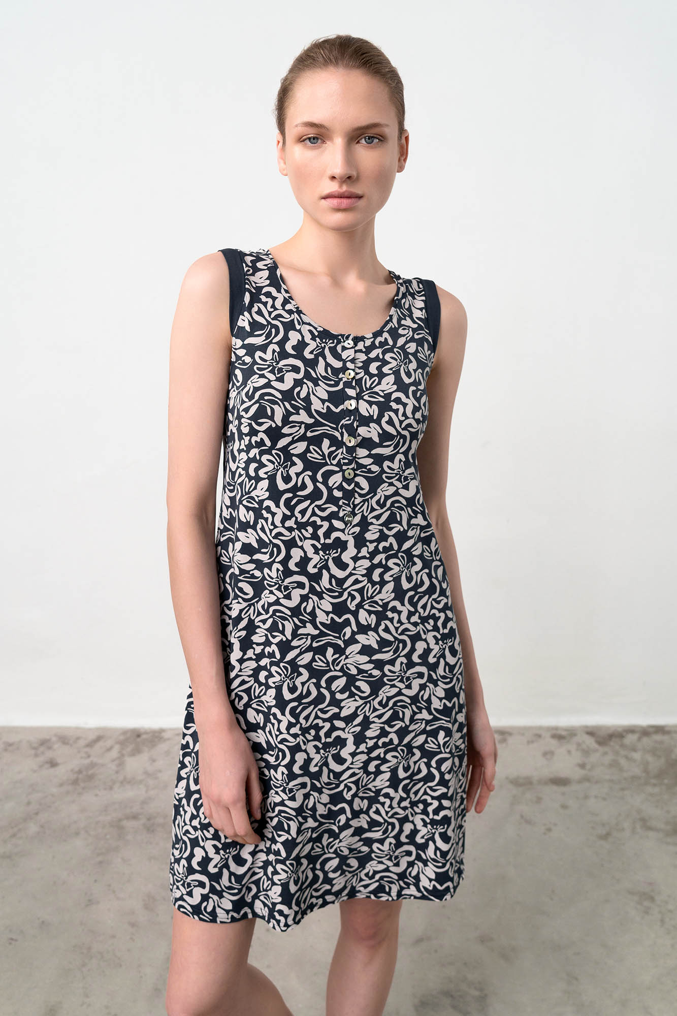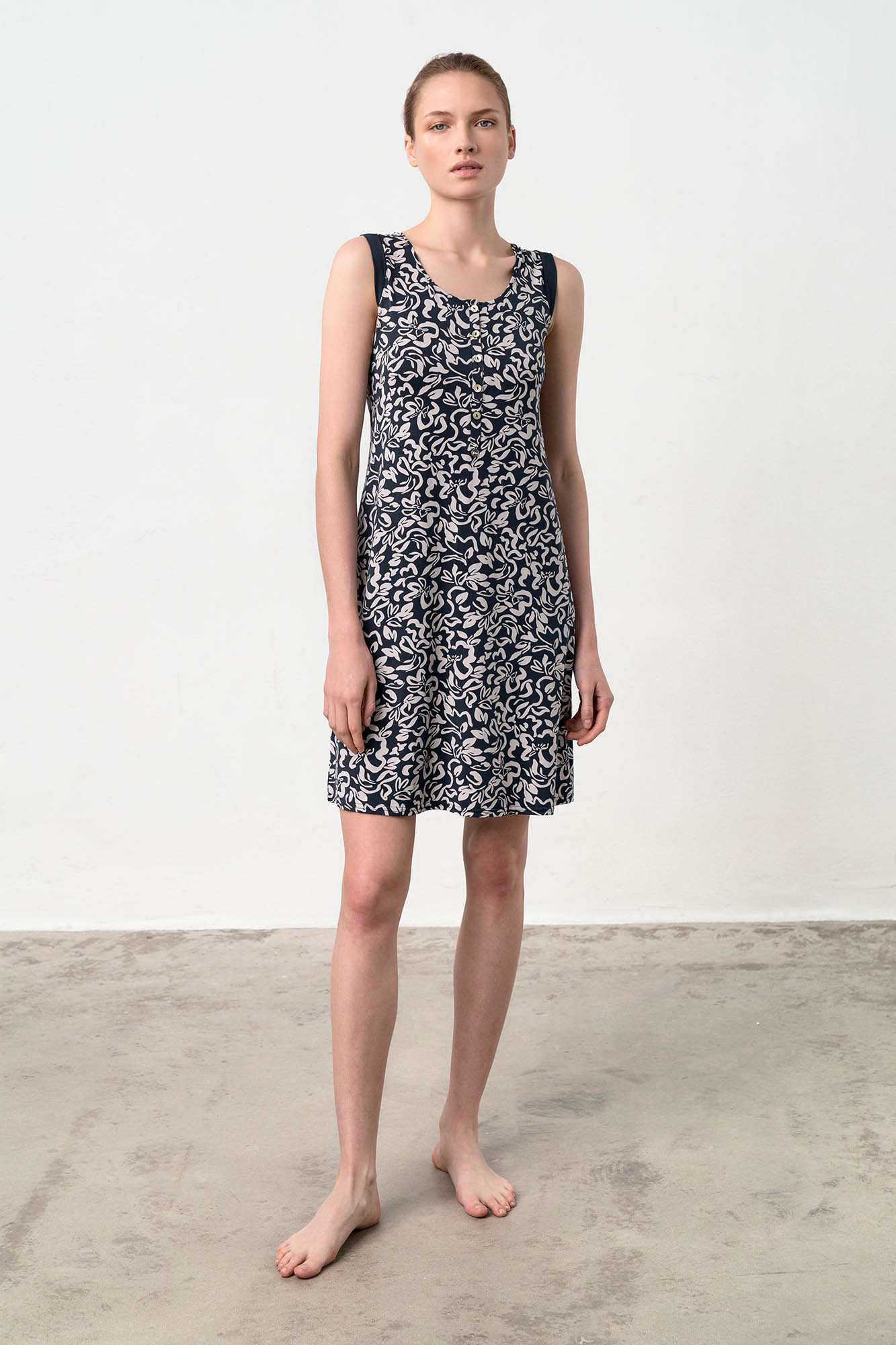 Αμάνικο νυχτικό με πατιλέτα σε χαλαρή γραμμή. Ένα μοντέρνο, φλοράλ  σχέδιο σε μπλέ απόχρωση που θα ντύσει με άνεση το καλοκαίρι σας.