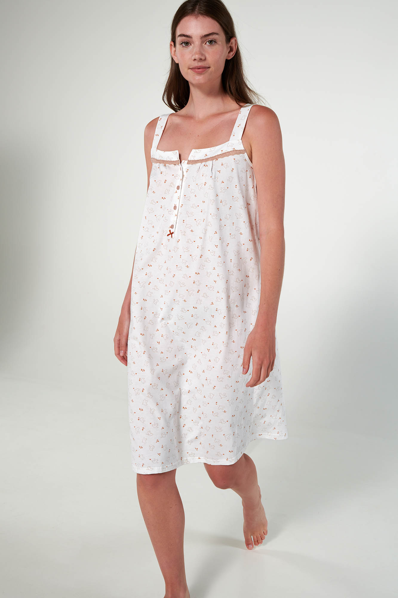 Εμπριμέ, αμάνικο νυχτικό με πατιλέτα και πιέτα σε χαλαρή γραμμή. Μια καθημερινή επιλογή σε γήινες αποχρώσεις.