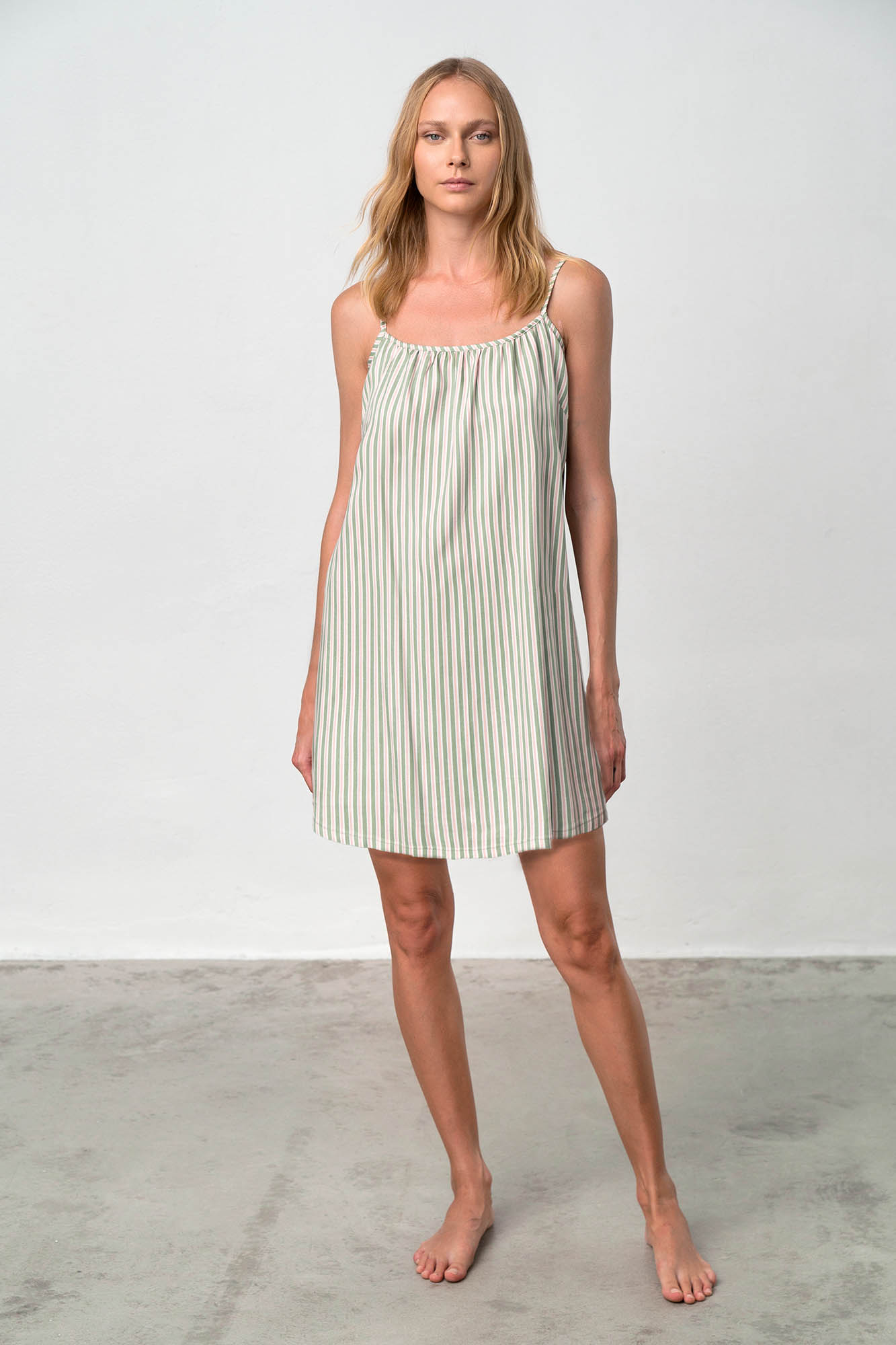 Νυχτικό με στρογγυλή λαιμόκοψη και λεπτή τιράντα σε χαλαρή γραμμή. Ένα όμορφο καλοκαιρινό σχέδιο σε δροσερές, παστέλ αποχρώσεις.