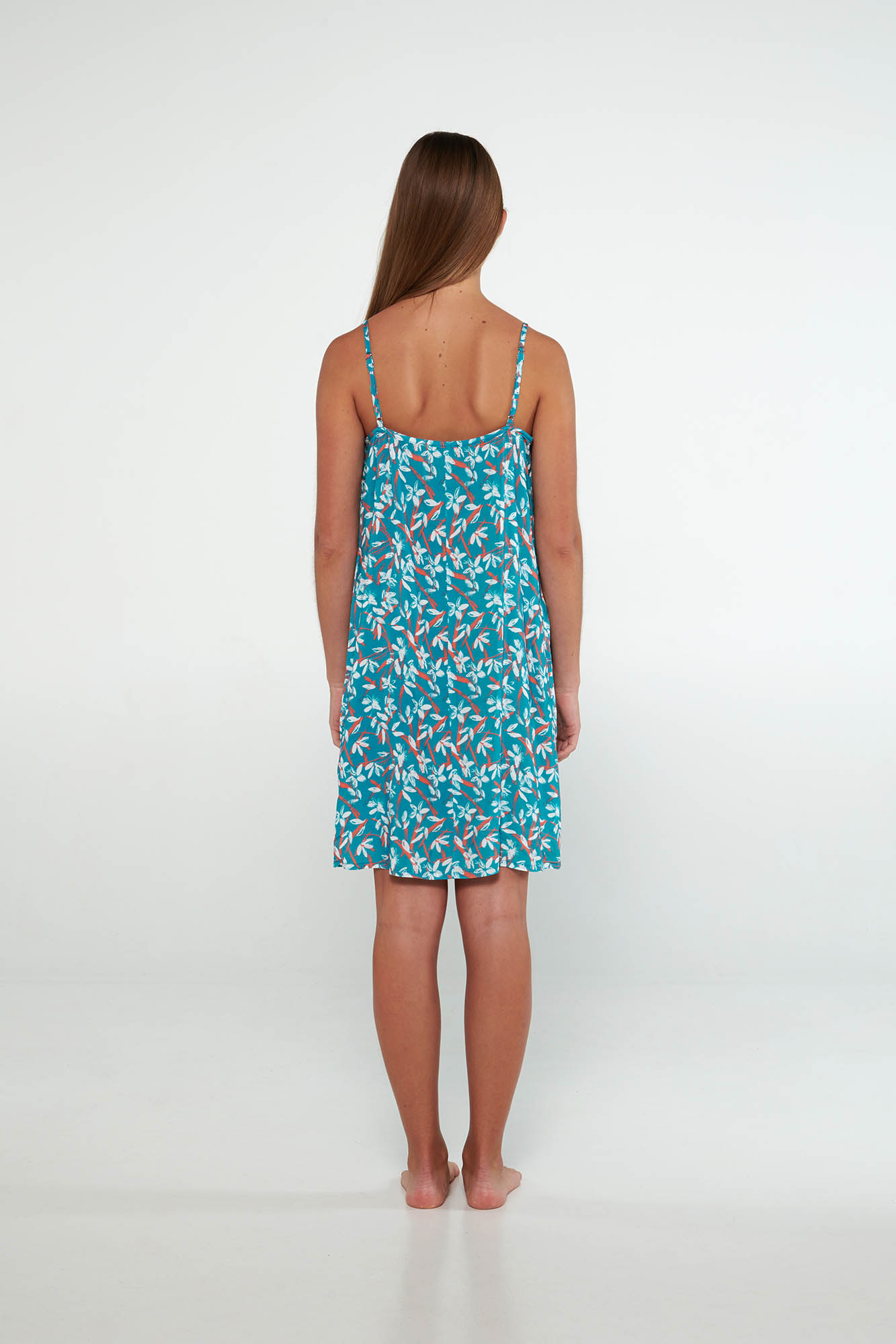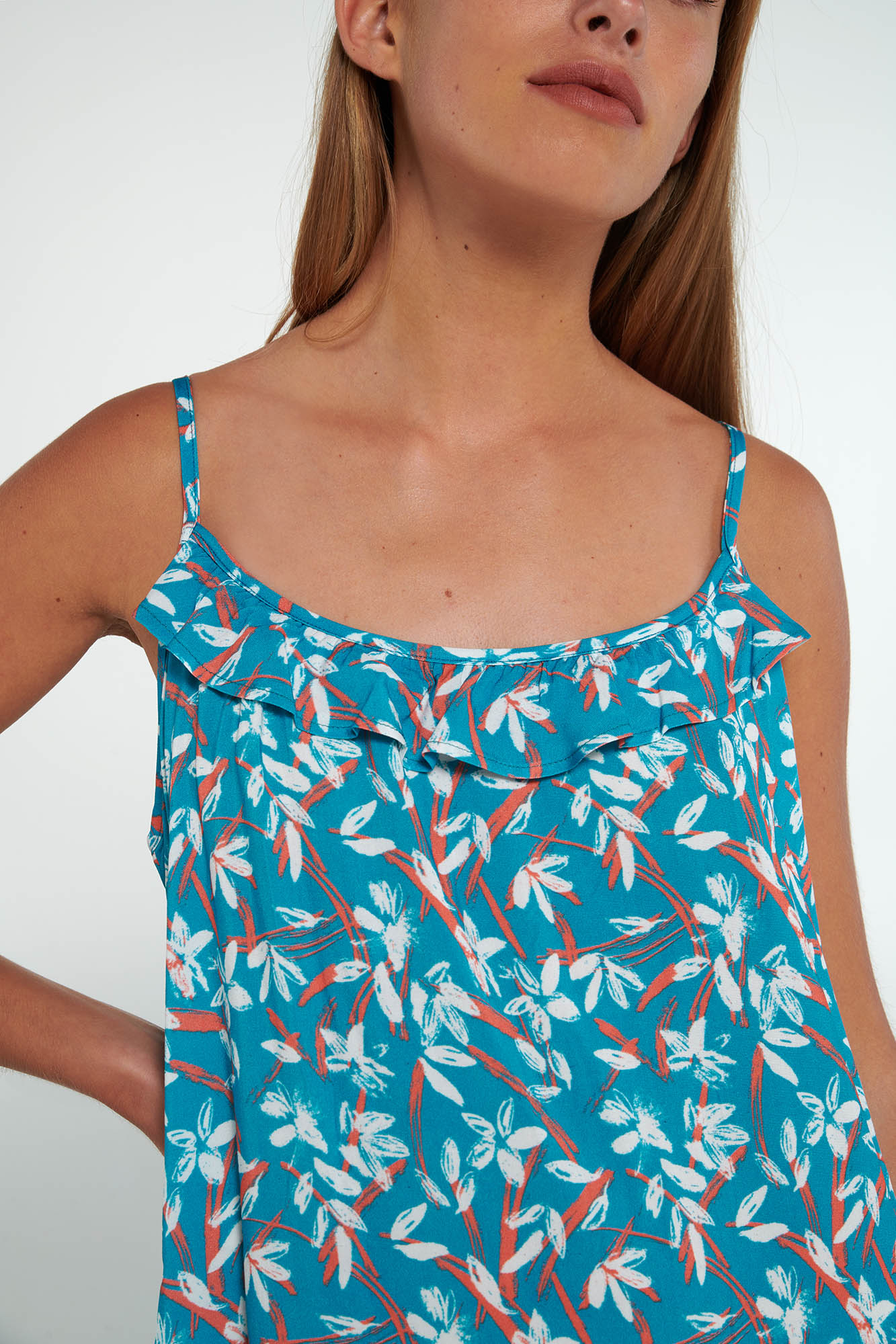 Εμπριμέ, νυχτικό με τιράντες και στρογγυλή λαιμόκοψη, σε χαλαρή γραμμή. Ένα δροσερό φλοράλ σχέδιο σε καλοκαιρινές αποχρώσεις.