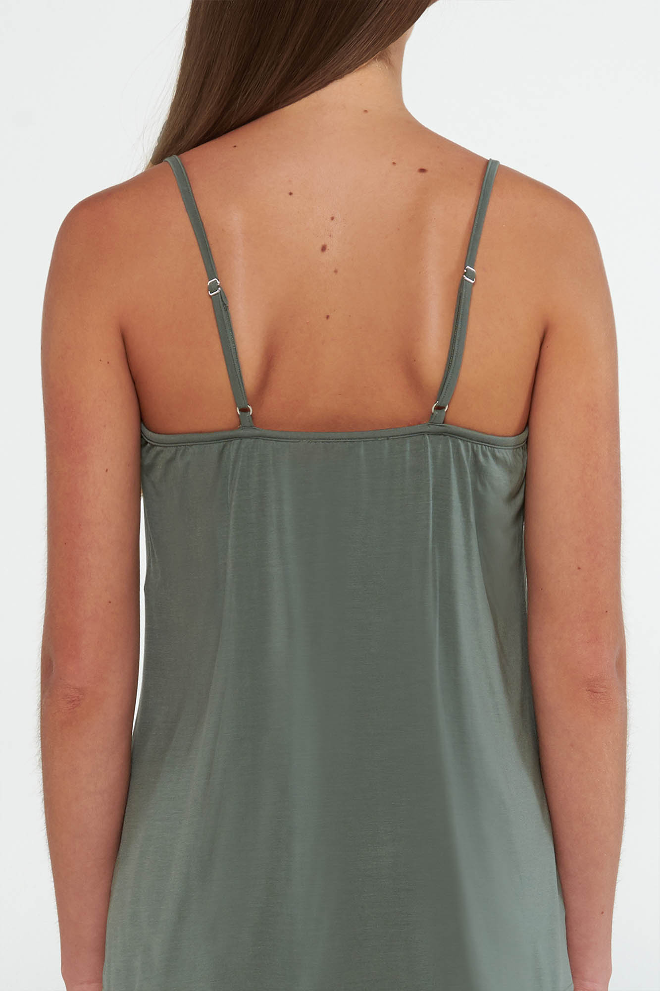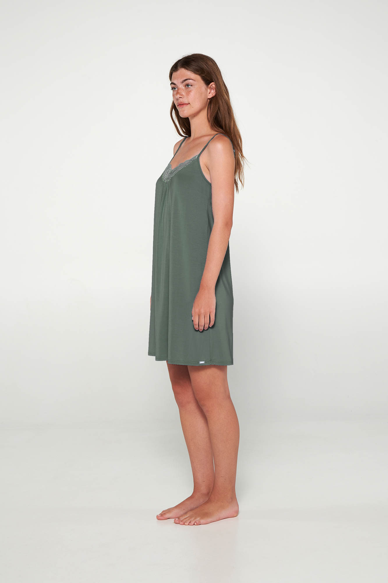 Νυχτικό με τιράντες λαιμόκοψη με δαντέλαι και πιετα στο στήθος, σε χαλαρή γραμμή. Διαχρονική, μονόχρωμη κομψότητα.