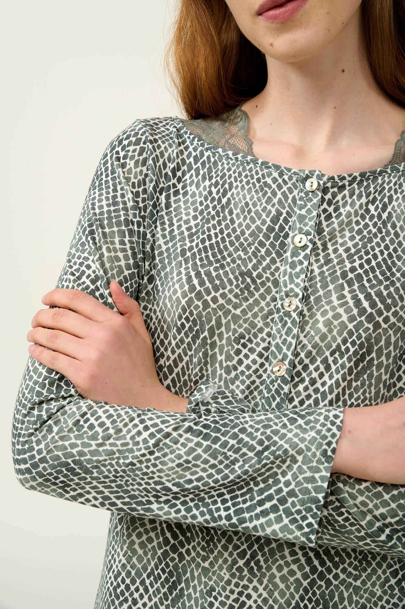Επιλέξτε ένα χειμερινό νυχτικό που συνδυάζει κομψότητα και άνεση, ιδανικό για τις στιγμές χαλάρωσης στο σπίτι ή τον ύπνο. Είναι κατασκευασμένο από απαλό LENZING Tencel Modal Micro, που επιτρέπει στο δέρμα να αναπνέει και αγκαλιάζει ευχάριστα το σώμα . Διαθέτει πατιλέτα, μακριά μανίκια και διακριτικές λεπτομέρειες δαντέλας, που προσθέτει μια νότα θηλυκότητας. Μια εκλεπτυσμένη εκδοχή του animal print αποτυπώνεται σε μια ιδιαίτερη πράσινη ανθρακί απόχρωση, χαρίζοντας στο σχέδιο έναν σύγχρονο και διακριτικό χαρακτήρα.