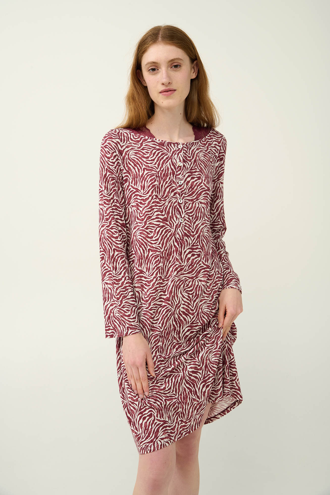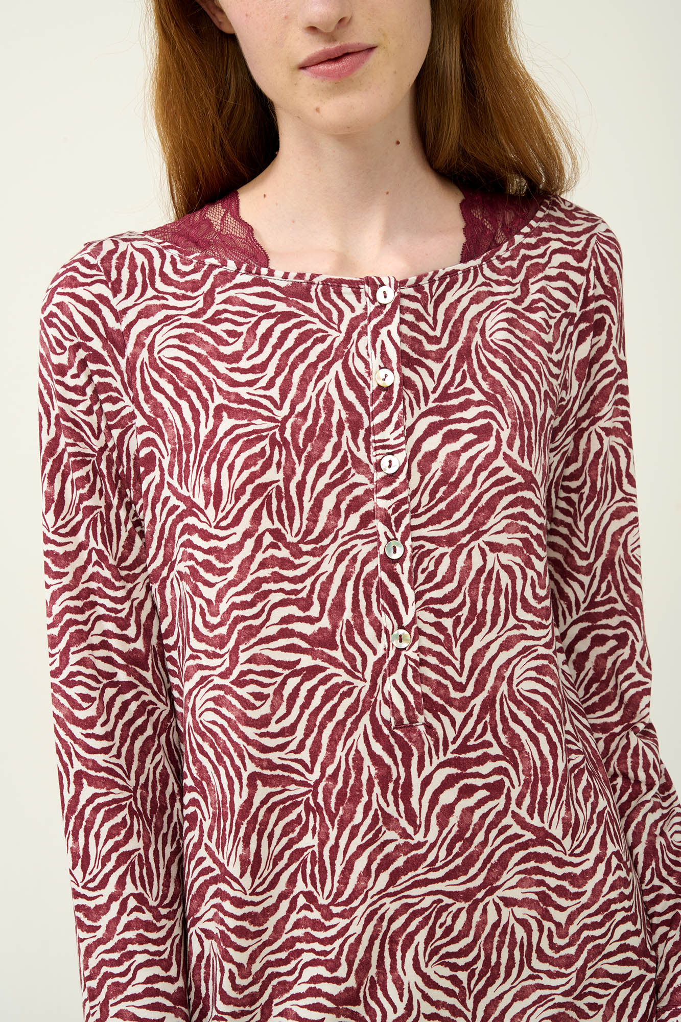 Ανακάλυψε την ιδανική ισορροπία ανάμεσα στην άνεση και το στυλ με αυτό το κομψό χειμερινό νυχτικό, φτιαγμένο από απαλό και διαπνέον LENZING Tencel Modal Micro. Σχεδιασμένο με πατιλέτα σε εκλεπτυσμένο μοτίβο ζέβρα σε λευκές – μπορντό αποχρώσεις και διακριτικές λεπτομέρειες από δαντέλα, που χαρίζουν μια αίσθηση πολυτέλειας. Ιδανικό για στιγμές χαλάρωσης στο τέλος μιας μεγάλης ημέρας.