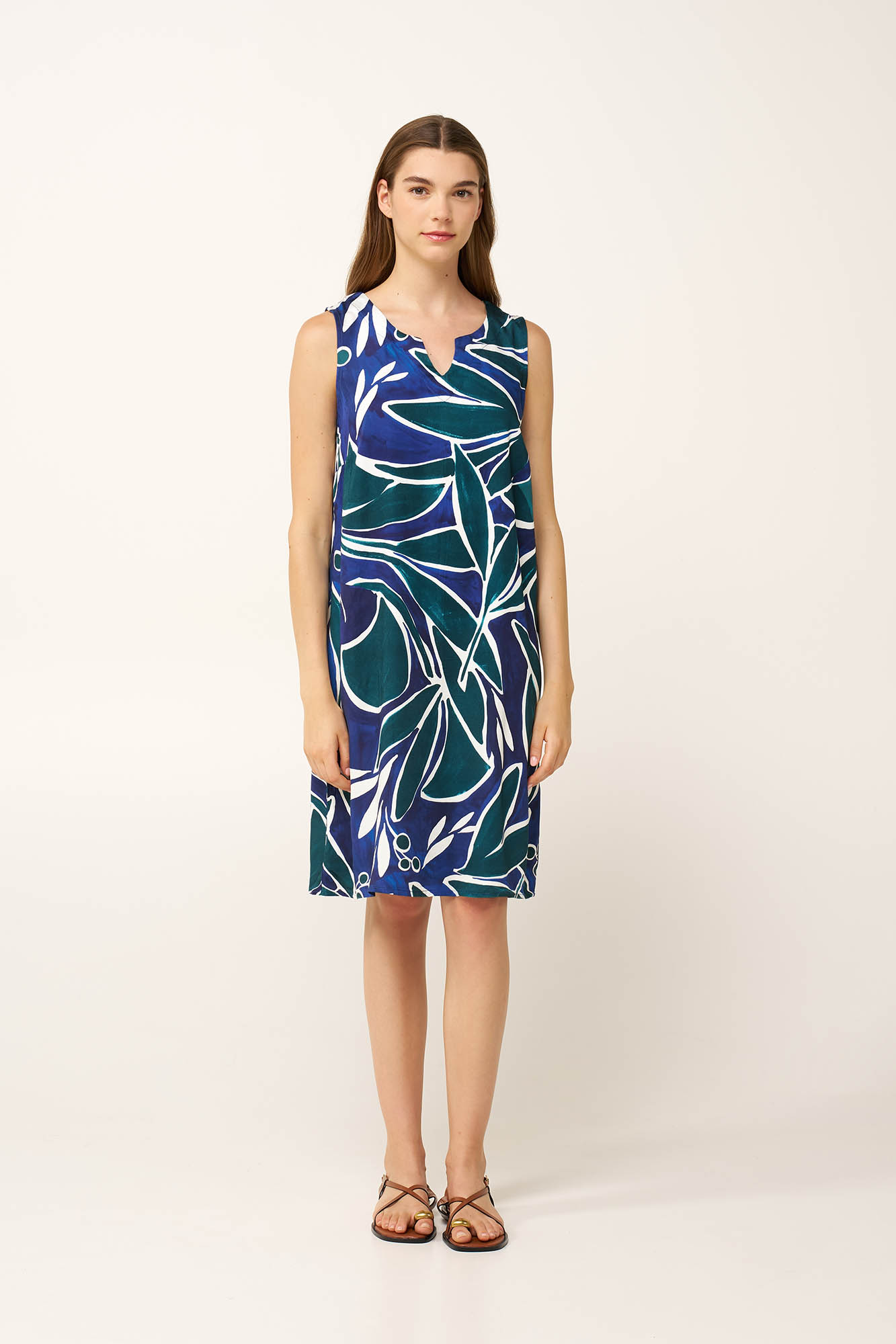 Ανανεώστε την καλοκαιρινή σας γκαρνταρόμπα με αυτό το φόρεμα από 100% viscose ποπλίνα, που προσφέρει απαλή και άνετη αίσθηση τις ζεστές ημέρες. Ο αμάνικος σχεδιασμός του δημιουργεί μια καθαρή, λιτή γραμμή, ιδανική για την καθημερινότητα. Το έντονο γραφικό print με αφηρημένα σχήματα σε ωκεάνιους τόνους προσθέτει μοντέρνο και δυναμικό χαρακτήρα, δίνοντας ζωντάνια στο σύνολο. Μια εύκολη επιλογή για εξορμήσεις στην παραλία, καλοκαιρινές συναντήσεις ή βόλτες στην πόλη κάτω από τον ήλιο.