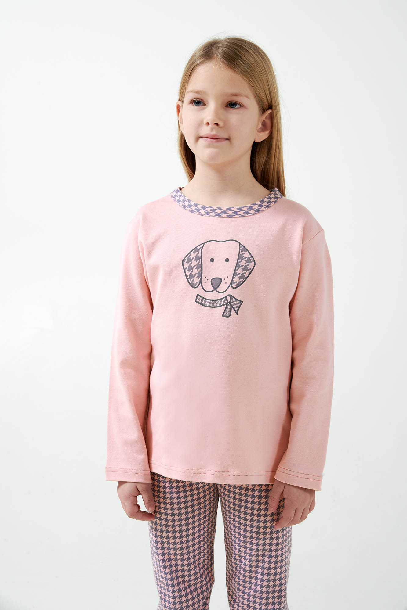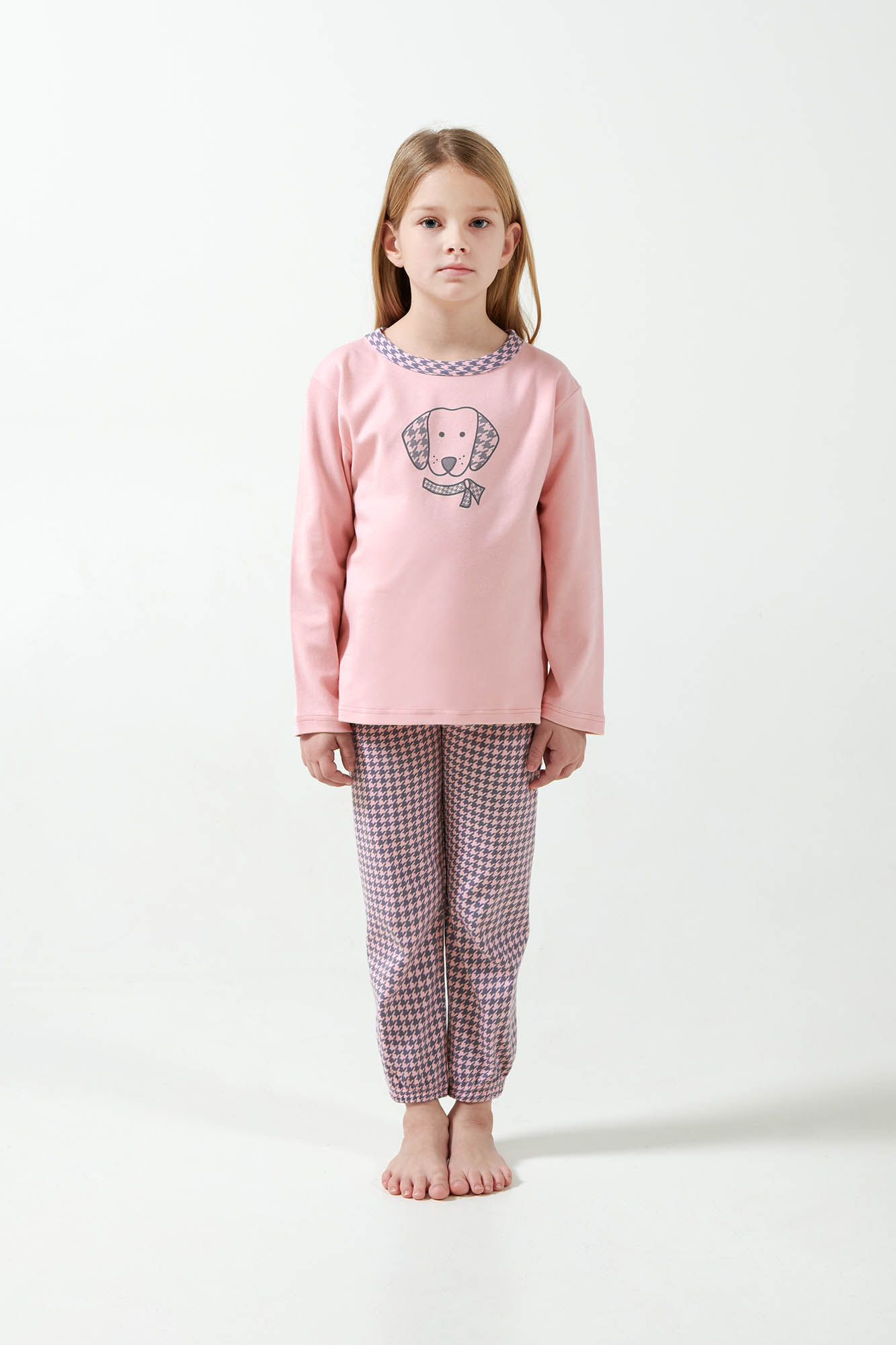 Αφήστε το παιδάκι σας να απολαύσει το βραδινό του ύπνο με ένα χαριτωμένο σετ παιδικές πυτζάμες. Μπλούζα σε απαλό ροζ χρώμα με τύπωμα στο στήθος και παντελόνι σε houndstooth μοτίβο με διακριτικές μανσέτες για βέλτιστη εφαρμογή. Το σετ είναι κατασκευασμένο από 100% βαμβάκι interlock που προσφέρει ζεστή και απαλή αίσθηση στο σώμα, επιτρέποντας στο δέρμα να αναπνέει. Μια όμορφη πρόταση για τις στιγμές του παιχνιδιού και της χαλάρωσης στο σπίτι.