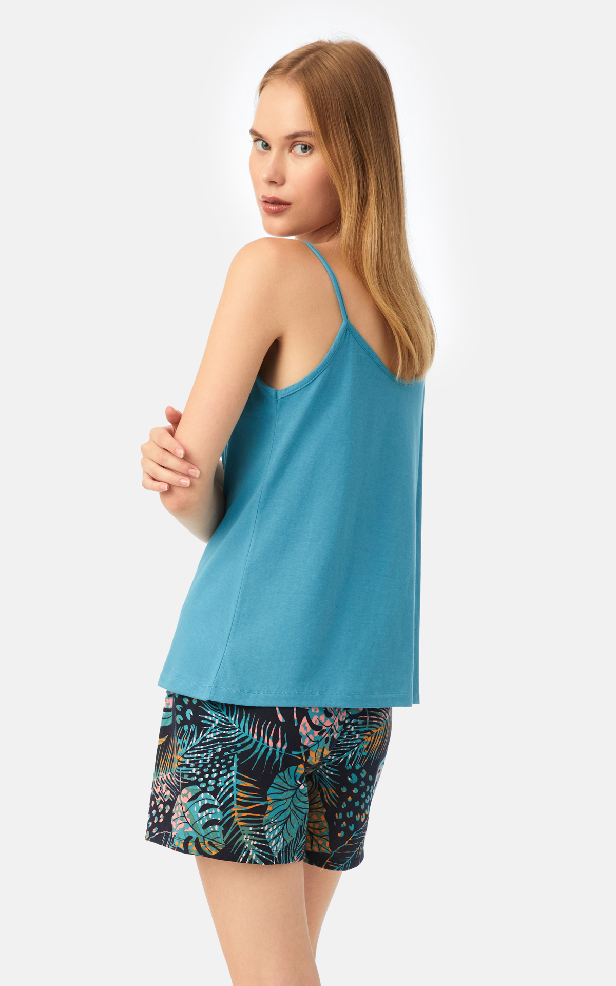 Σετ πυζάμας από 100% βαμβακερό ύφασμα, εξαιρετικής ποιότητας.Το σετ αποτελείται από αμάνικο μονόχρωμο τοπ με μπριτέλα και τύπωμα στο στήθος, και σορτς τυπωμένο all over. (Petrol aqua)