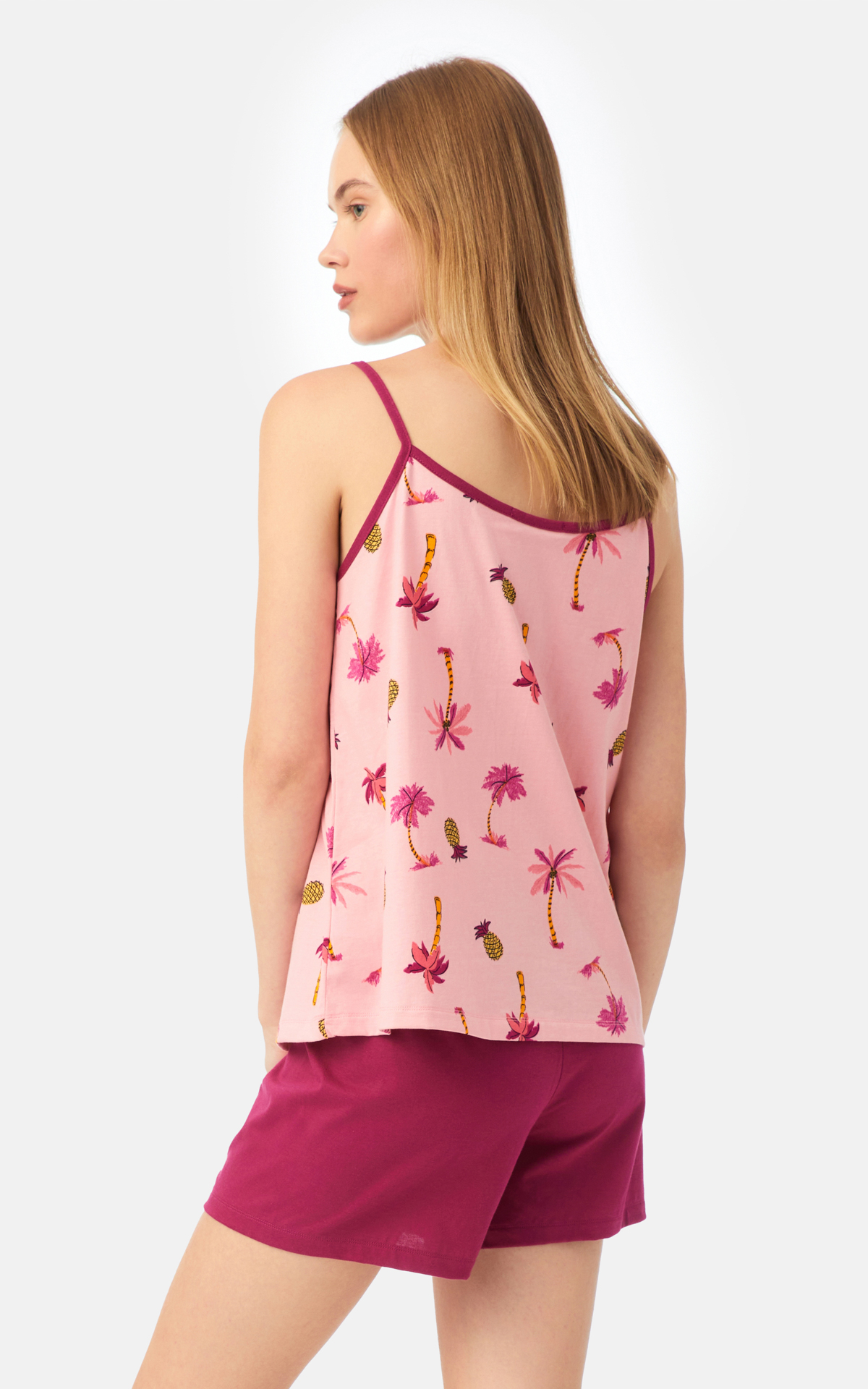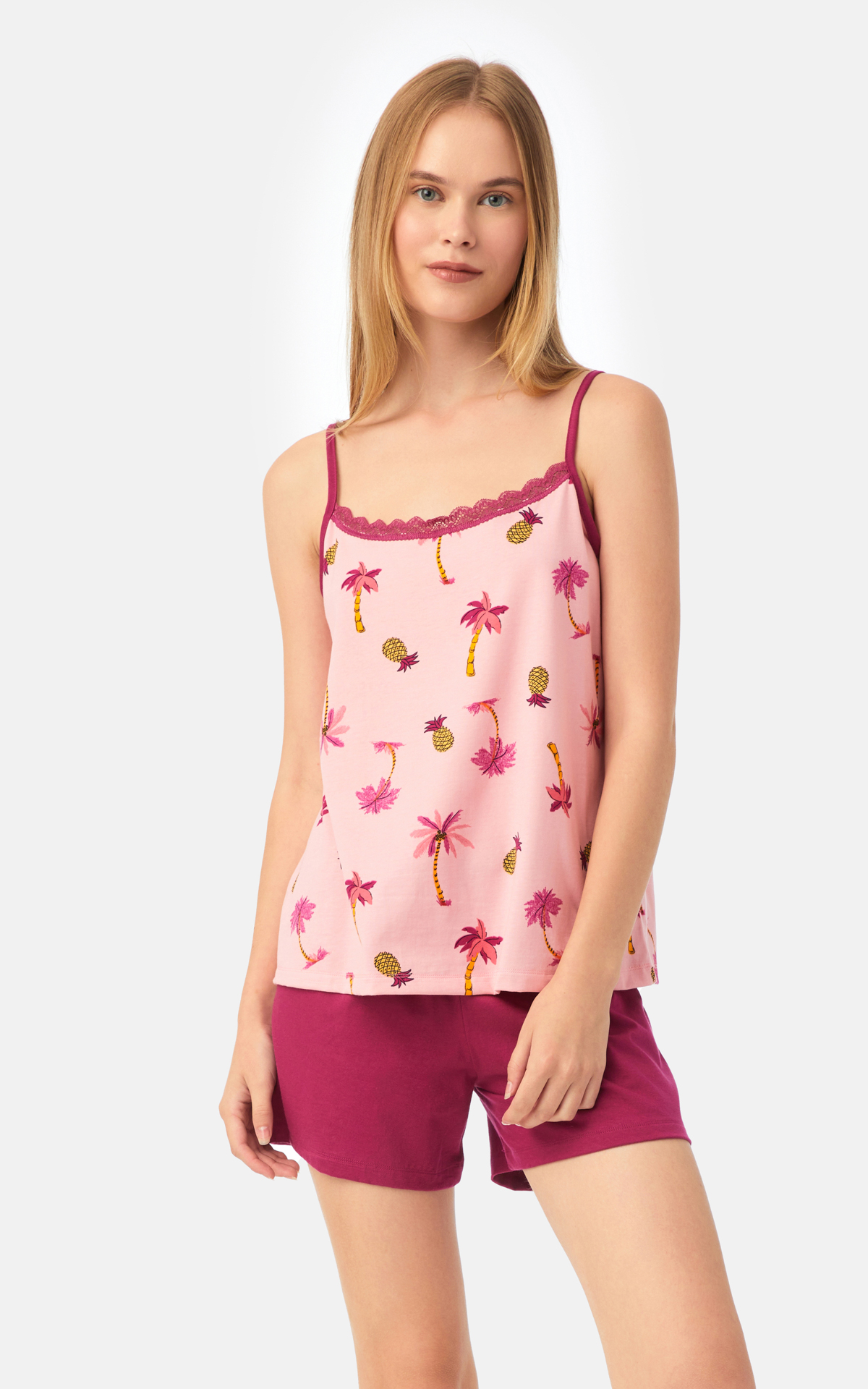 Σετ πυζάμα από 100% βαμβακερό ύφασμα, εξαιρετικής ποιότητας.Το σετ αποτελείται από τοπ με μπριτέλα με δαντελάκι στο λαιμό και σόρτς, σε μονόχρωμο ή τύπωμα all over. (Pink pineapple)