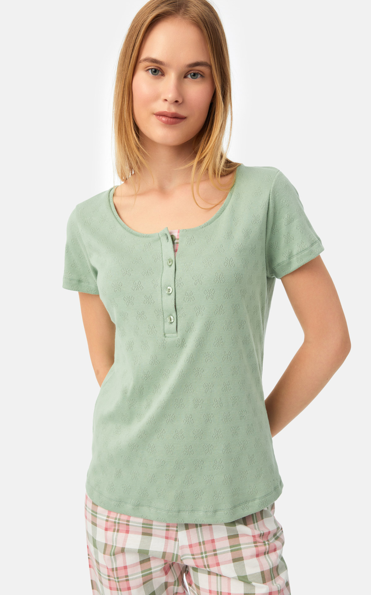 Σετ πυζάμας από 100% βαμβακερό ύφασμα, εξαιρετικής ποιότητας. Το σετ αποτελείται από κοντομάνικο τοπ, rib pointelle με πατιλέτα και κάπρι παντελόνι στη μέση της γάμπας, τυπωμένο all over. (Green)
