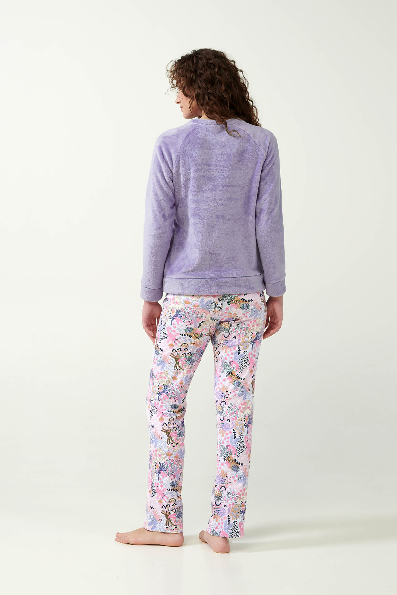 Προσθέστε στη συλλογή σας ένα αξιαγάπητο σετ γυναικείες πυτζάμες σε απαλές αποχρώσεις λεβάντας. Η μπλούζα είναι κατασκευασμένη από fleece που αφήνει μια ζεστή και απαλή αίσθηση στο δέρμα. Το σετ συμπληρώνει αρμονικά ένα παντελόνι από 100% βαμβάκι interlock σε ένα ευφάνταστο μοτίβο με τίγρεις νεράιδες. Ο συνδυασμός υφών κάνουν αυτό το σετ μια ιδιαίτερη πρόταση που θα απολαύσετε στις στιγμές χαλάρωσης σας.